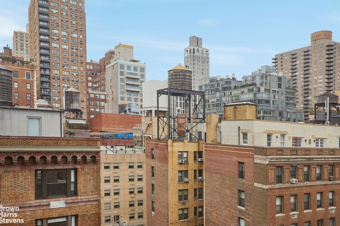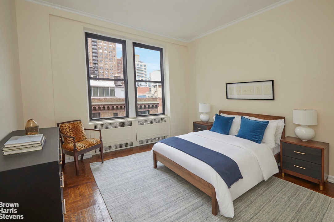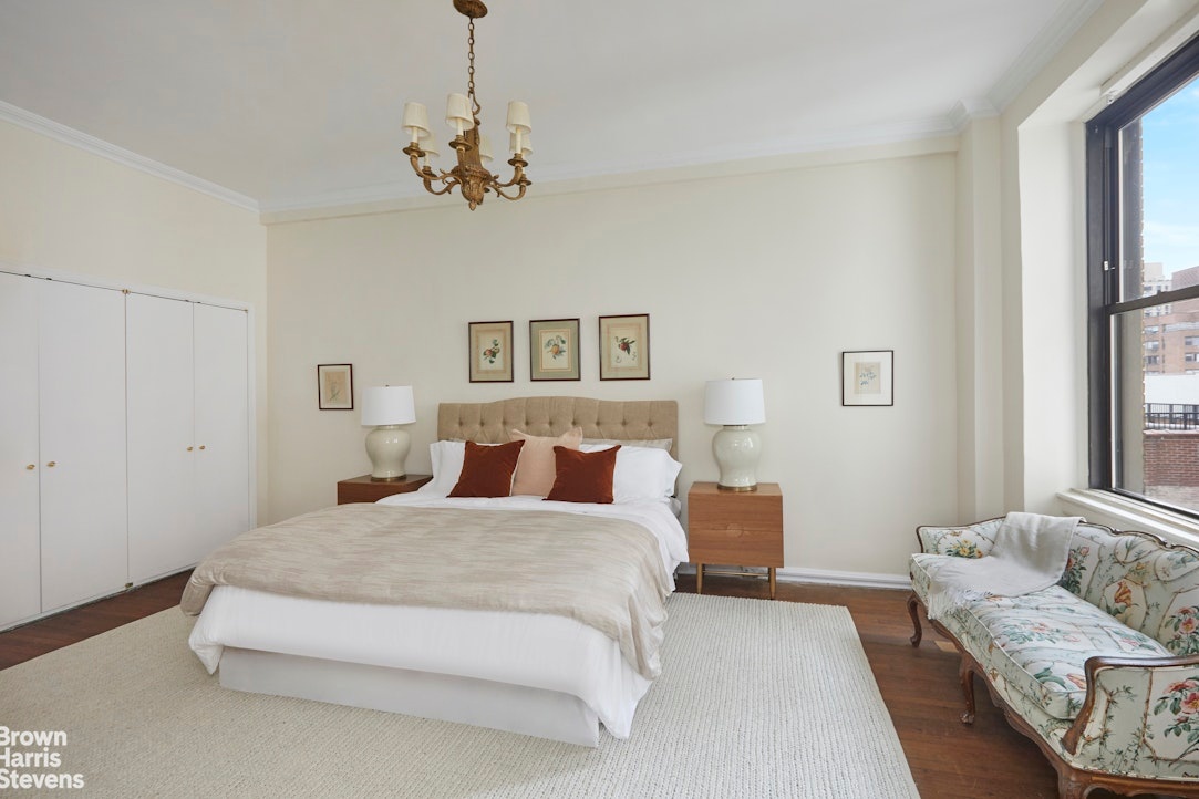 Arriving from your semi private elevator landing, once you enter apartment 8E you immediately notice the amazing scale of the apartment. The square foyer measuring roughly 10" x10" flows seamlessly into the large 27'5" x 18'4" living room (which can easily be divided into 2 sizeable rooms) with open views. The primary suite is equally well proportioned, with 2 entire walls of closets, great southern light, and a windowed ensuite bathroom. The second bedroom has a walk-in closet and the bath is accessible from the hallway. Ceilings throughout are between 10'3" and 10'7". Thru wall A/C and Washer/ Dryers are permitted with board approval. Basement storage included with the sale.