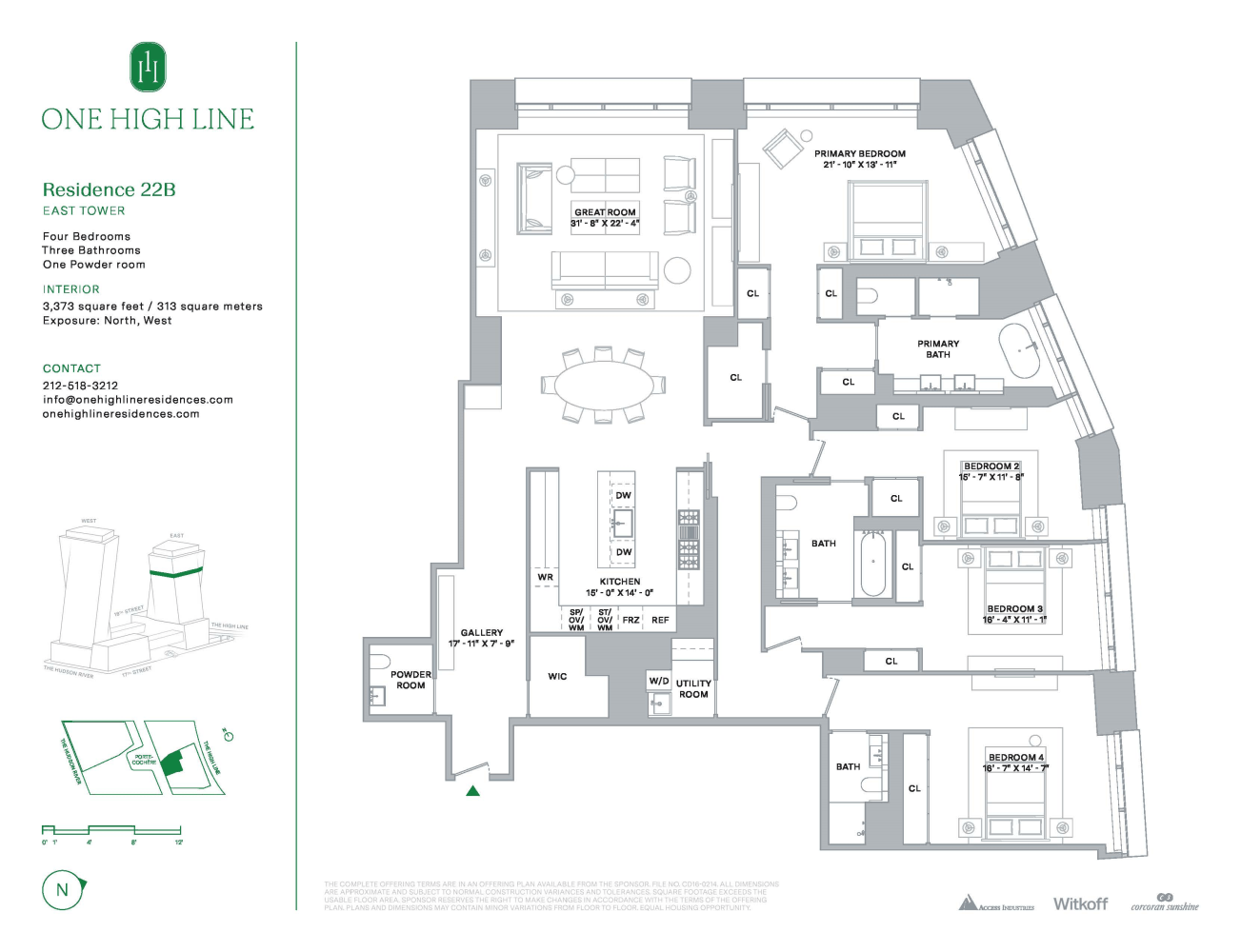 East 22B at One High Line is a 3,373 SF four-bedroom and three-and-a-half-bathroom residence featuring west and north exposures. This exceptional home boasts a generous great room finished with natural oak chevron floors and open kitchen with elegant Carnico Grigio marble floors, Molteni brushed Epicea wood and white lacquer cabinetry with cove lighting, and honed Calacatta Gold marble countertops and backsplash. A Calacatta Gold marble island with a brass patina frame is complemented by a raised St. Laurent marble. Fully integrated appliances include a Gaggenau refrigerator, convection oven, speed oven, and Miele ventilation hood, dishwasher, and undercounter wine refrigerator.