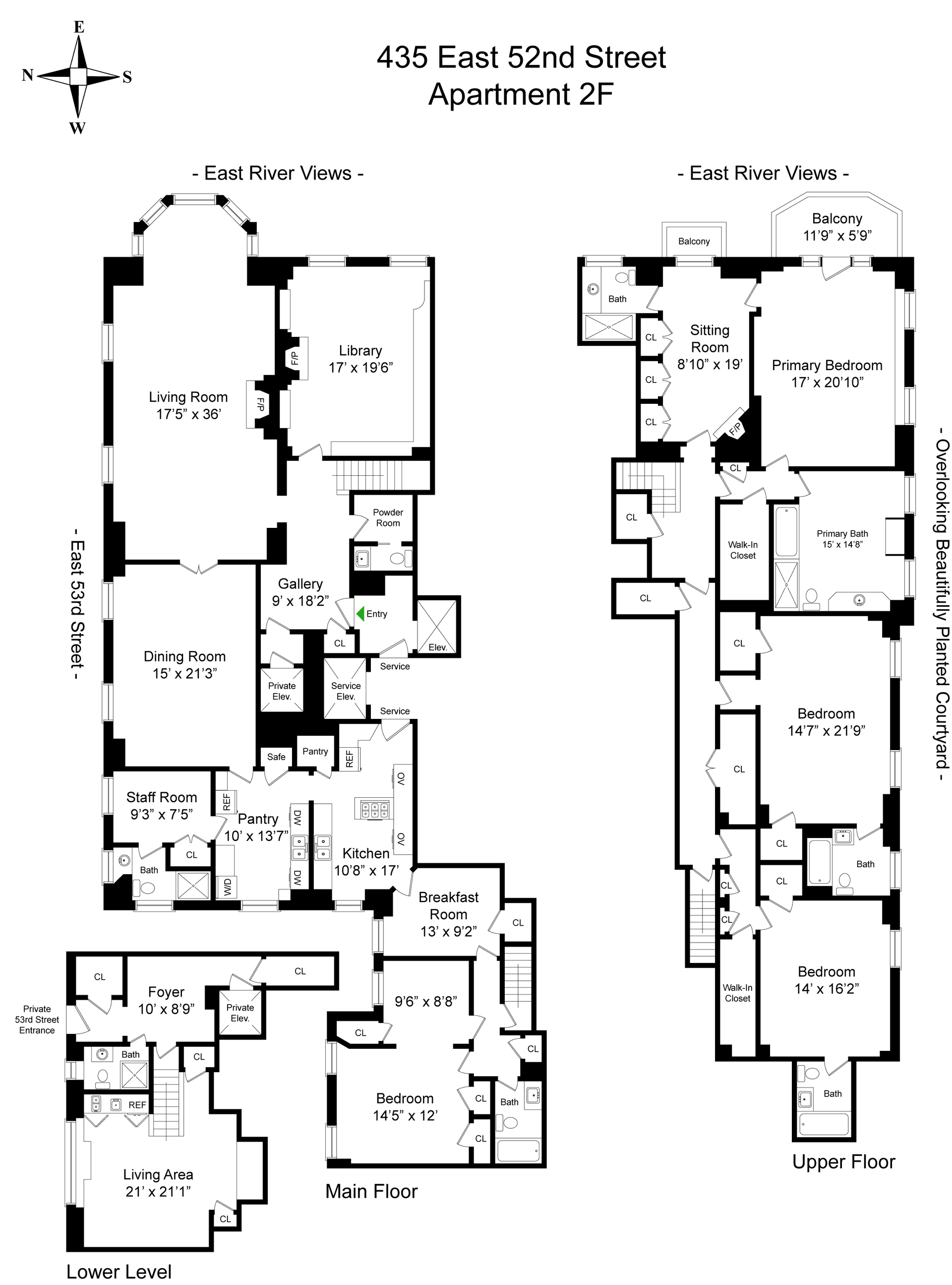 Above, tranquil private quarters feature a delightful Primary Suite with sparkling views of the East River from the immensely large Bedroom and its adjoining Sitting Room, replete with a cozy corner fireplace. Both rooms open onto balconies overlooking the River, and the suite further incorporates very ample closets and two full baths. There are two additional Bedrooms, both with very ample closets and ensuite baths. All bedrooms benefit from glorious southern light and outlooks over the building’s beautiful courtyard gardens.