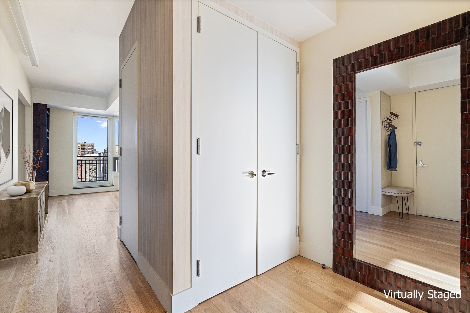 Its thoughtful elegance is well designed and every inch of this apartment is designed for great storage space. This includes, but is not limited to, six (6) custom closets and a custom kitchen pantry and also offers a custom built-in bar, full-size in-unit W/D, central heat and A/C with separate zones in each room, and eat-in-kitchen. Every room has custom Hunter Douglas window treatments, designer lighting fixtures, and newly refinished wide plank oak flooring. Enter this lovely abode and be greeted with a large foyer area with built-in seating, a coat/ handbag rack, and more custom space for your keys and mail.