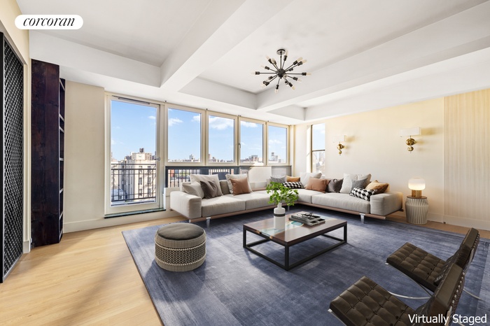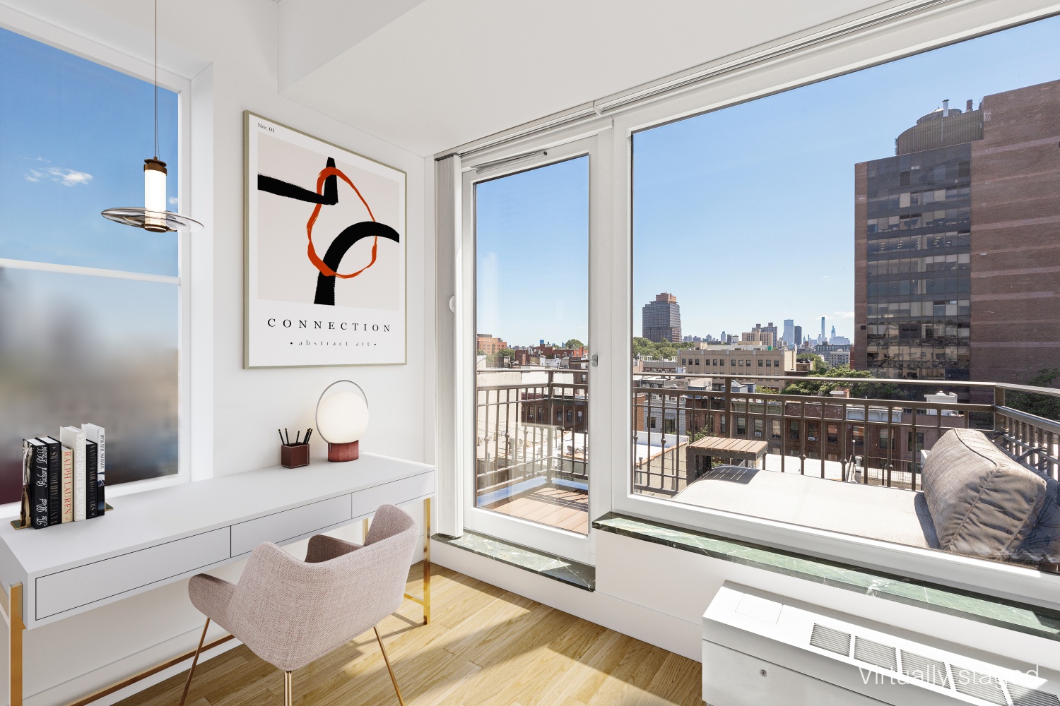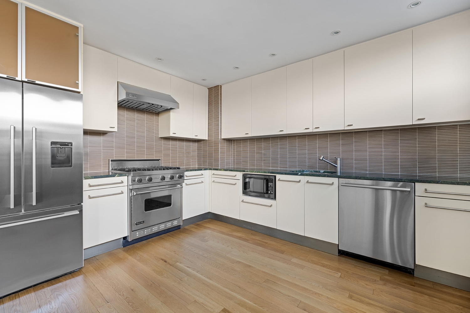 As you move north, you are drawn by a full wall of windows with open sky views, and just to the left is a large, windowed, eat-in-kitchen and open living room connect to the outdoor terrace seamlessly, creating an indoor-outdoor living space that is rare in the city. The kitchen includes considerable counter space, beautiful counters, custom cabinets, a Fisher Paykal Armoire refrigerator, a Viking Gas stove, a Bosch dishwasher, under mount lighting, and custom tile backsplash.