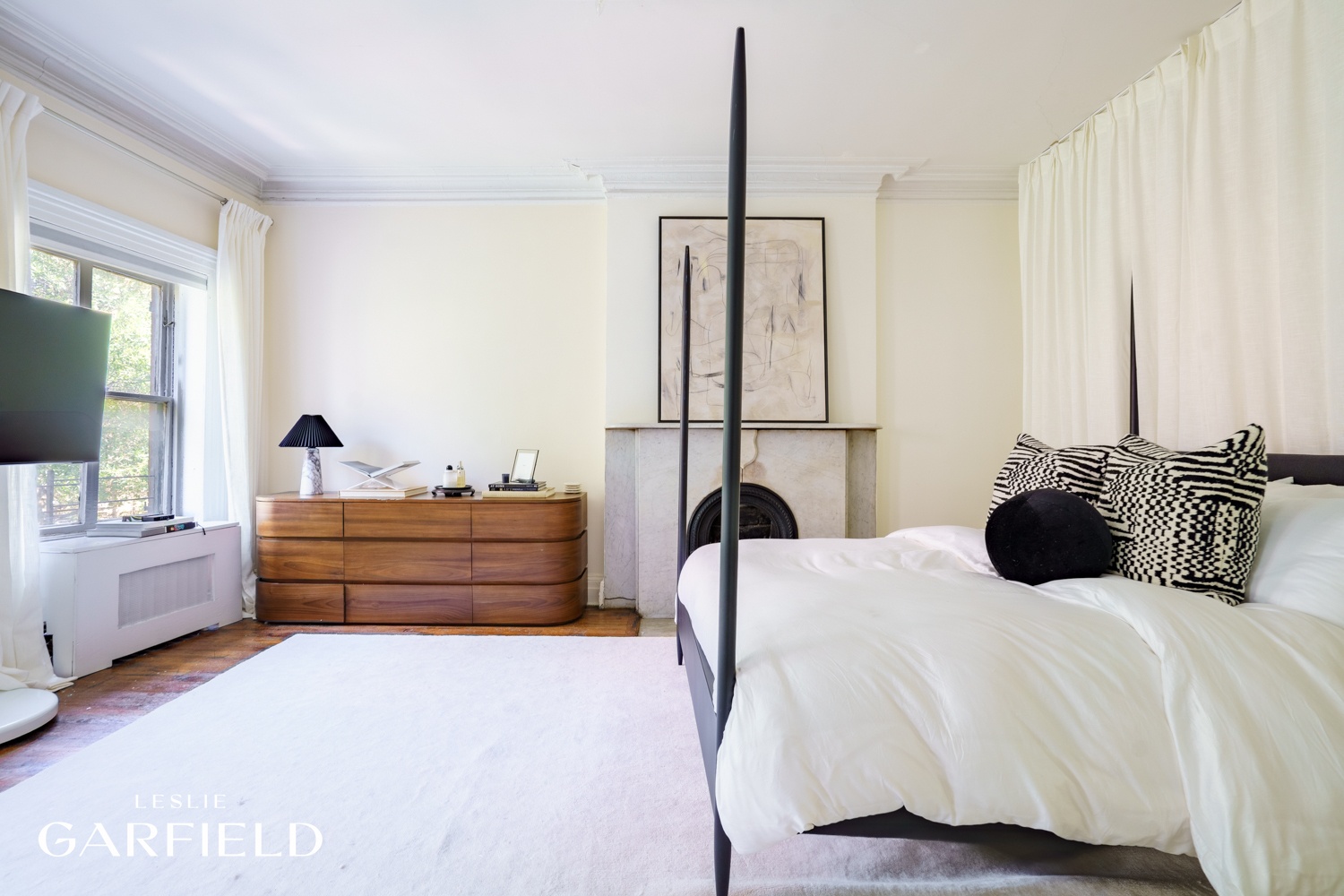 Inside, 19th-century architectural splendor abounds. The parlor floor boasts soaring 11-foot ceilings, beautifully preserved ornate moldings, and a rare Edwardian arch that gracefully separates the front and rear parlors. Adding to its charm, the home features nine working fireplaces, six adorned with original white marble mantels.