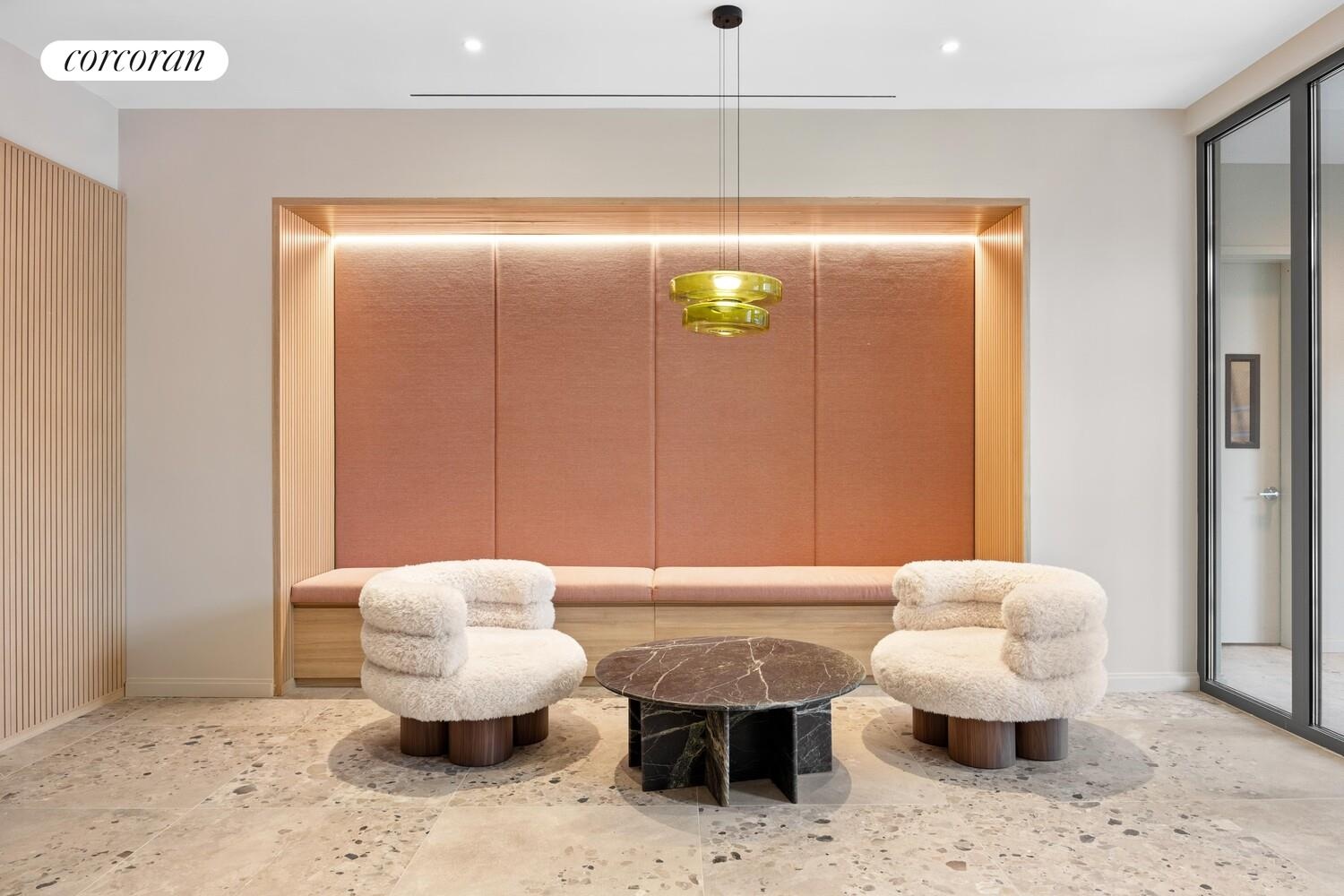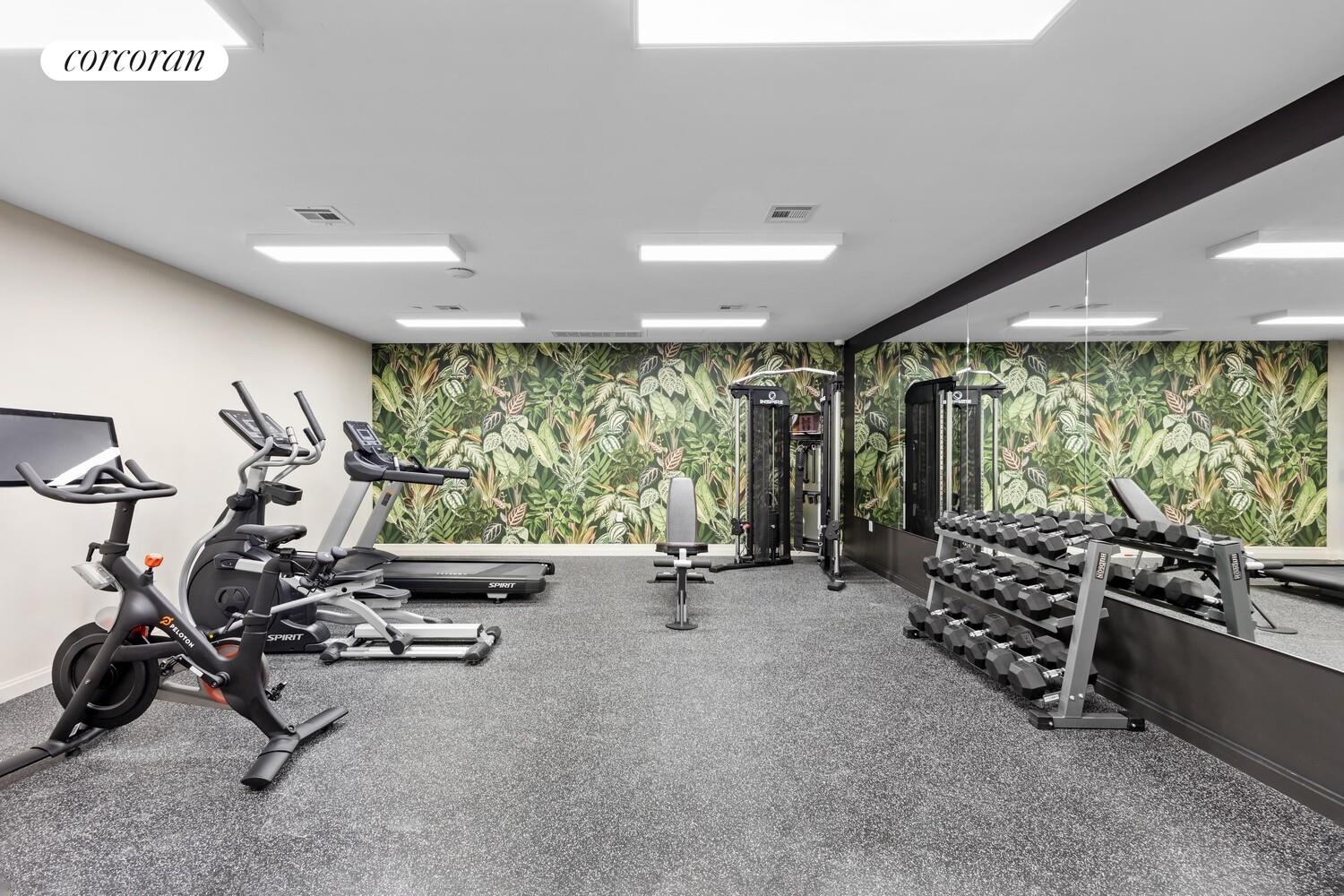 The same impressive, lush and modern aesthetic employed throughout the apartments also welcome you home every day into an impressive double-height lobby with Terrazzo floors, built-in seating, and a large package room. The Resident Lounge on this floor offers wonderful light through its corner location and includes comfortable modern furnishings, custom millwork, and large tables for working from home. Head downstairs into the wonderfully appointed fitness center that feels like a professional gym. A storage room for every unit is also located in the cellar for easy access. A common roof deck offers plantings, furniture, and an outdoor kitchen with a panoramic view of the Brooklyn skyline.