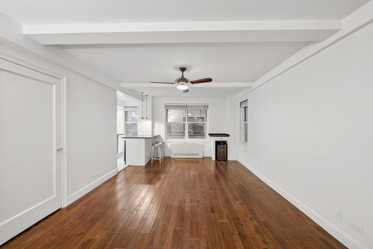 Welcome to Apartment 2D at 424 East 52nd Street, where elegance meets modern convenience in the heart of New York's famed Beekman neighborhood. This expansive studio, which functionally serves as a one-bedroom residence, has been meticulously renovated to offer a serene and sophisticated living experience.