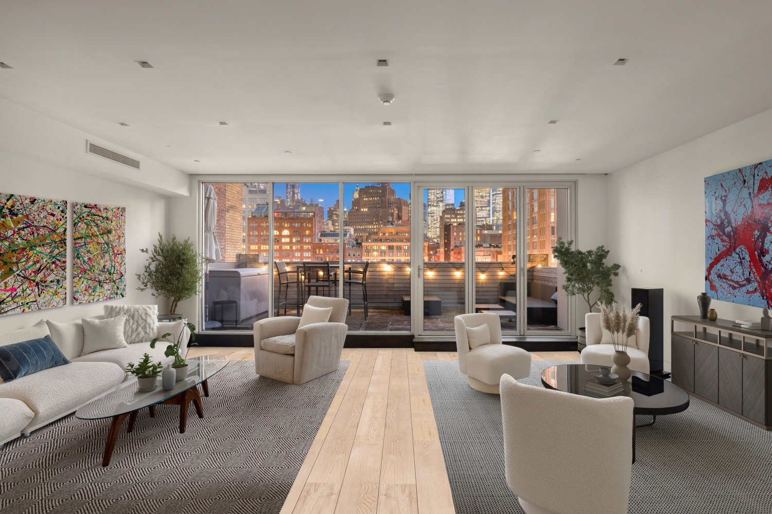 Perched at the top of a boutique luxury development overlooking downtown Manhattan and Tribeca's Historic District, the Penthouse at Laight House is a 3,730-square-foot triplex featuring 3 oversized bedrooms, 3.5 meticulously renovated bathrooms, and 1,284 square feet of outdoor spaces spanning multiple terraces and a landscaped roof deck.