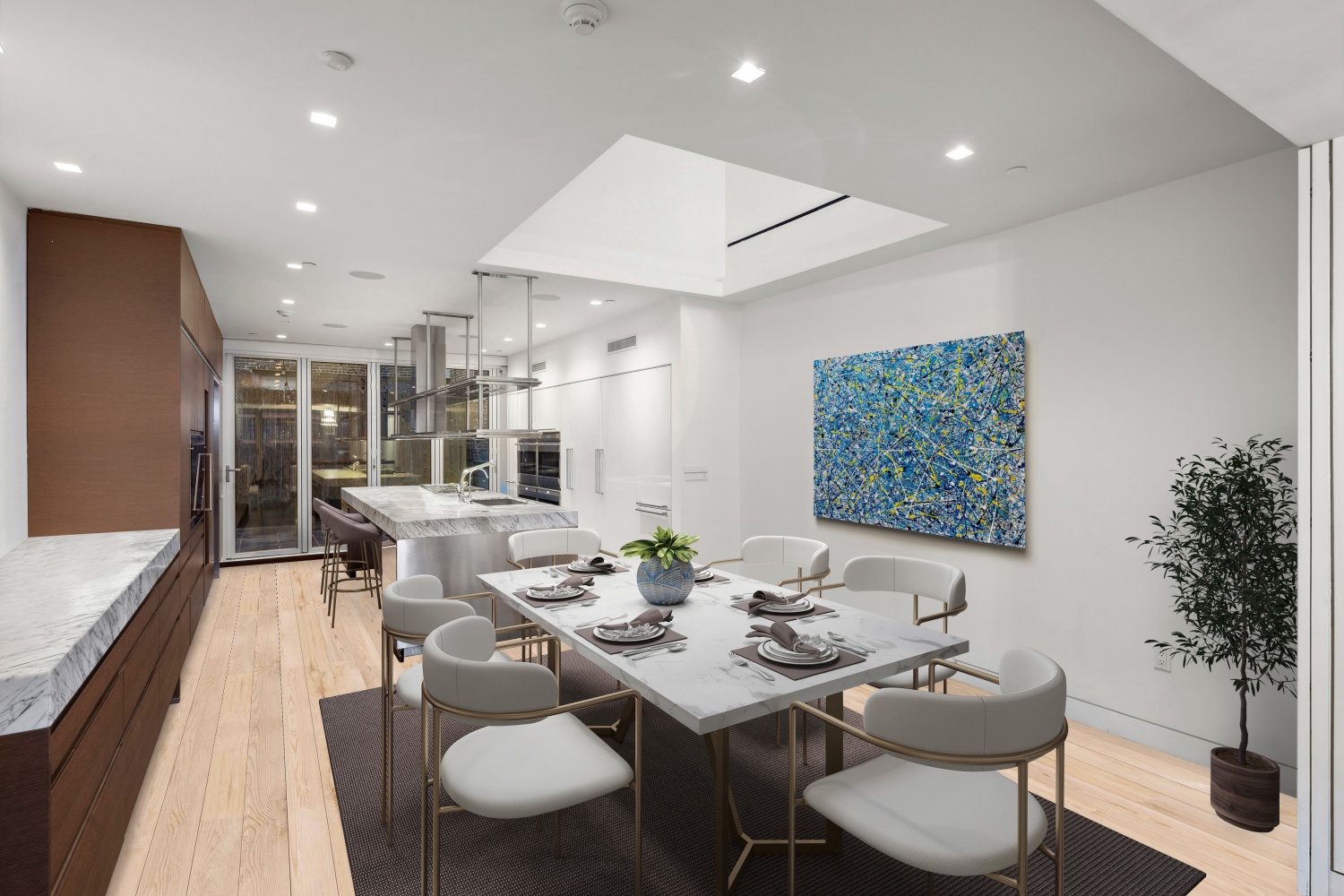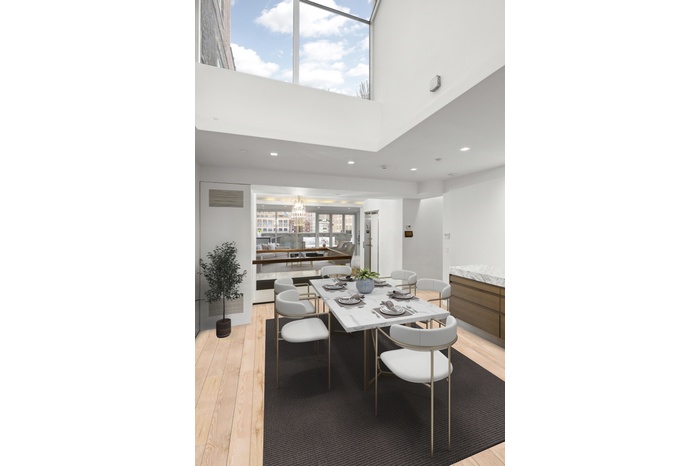 The first level of the home welcomes you into an oversized 23-foot-wide living space soaked in natural southern light beaming in from the floor-to-ceiling folding glass NanoWall system that opens onto the south-facing terrace to create a seamless indoor-outdoor flow. The living room leads you through a skylit dining space into a pristine chef's kitchen adorned with an eat-in island, bold marble slab countertops, custom cabinetry, a built-in pantry, and a suite of integrated high-end appliances including double ovens, a wine fridge, and vented six-burner gas range. A second north-facing folding glass NanoWall off the chef's kitchen allows for endless natural light and makes way for a tranquil terrace, perfect for al fresco dining. A dedicated powder room completes the first level of the home.