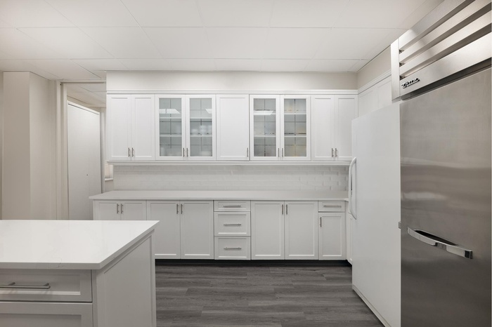 Off the central gallery, a large 40" x 18" great room with 11-foot ceilings and oversized windows capture abundant natural light from the north and east. Just beyond, a formal dining room with the capacity to comfortably host 20+ guests sets the stage for refined entertaining. The chef's kitchen is outfitted for serious culinary endeavors and is supported by a butler's pantry, a dedicated staff office, a generous storage room, and in-unit laundry. A den/library-also off the central entry gallery-and a large powder room complete the northern portion of the home.