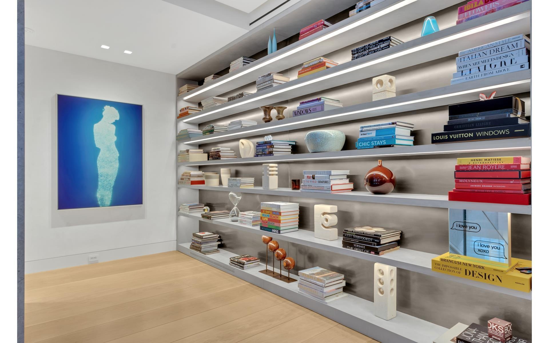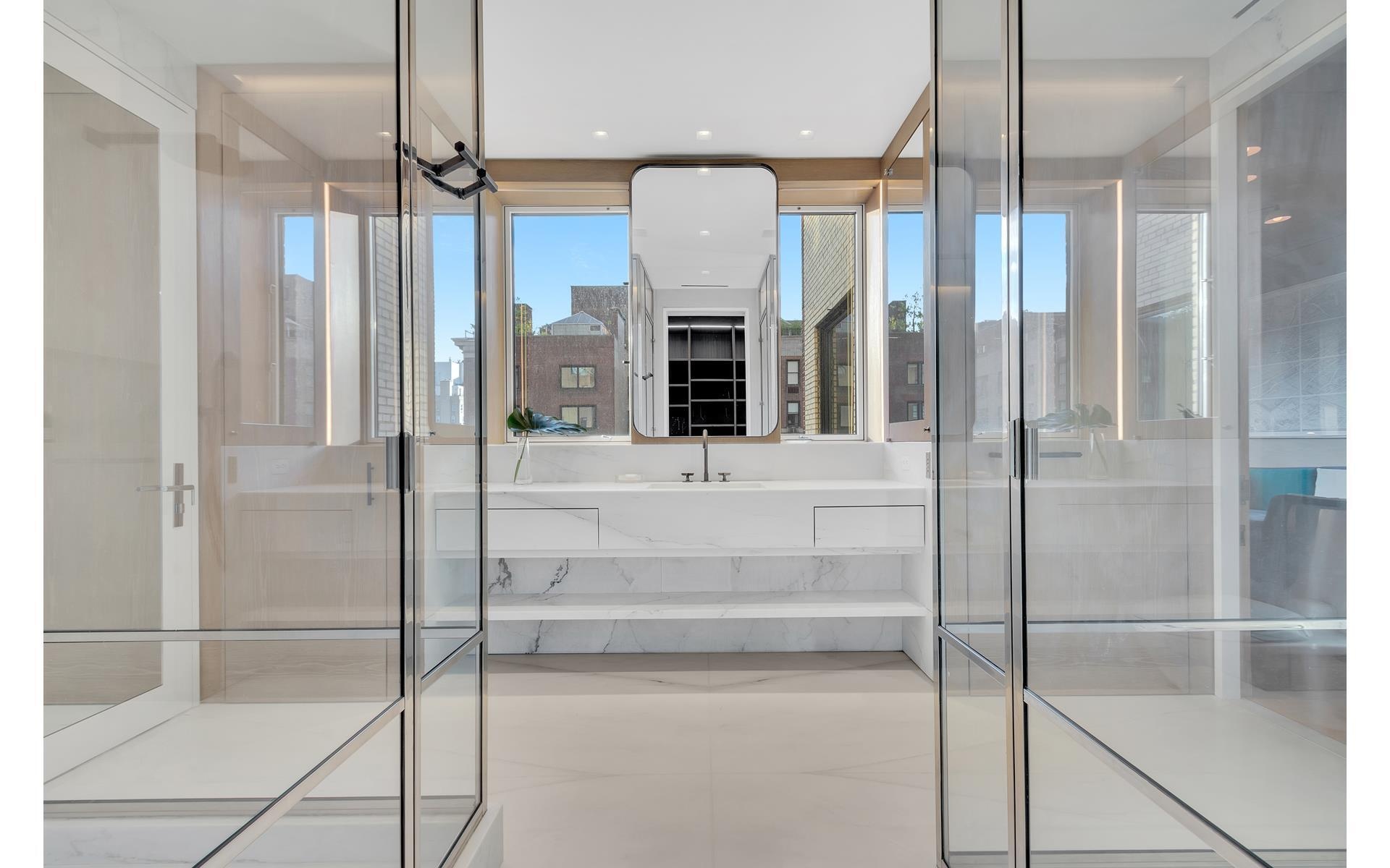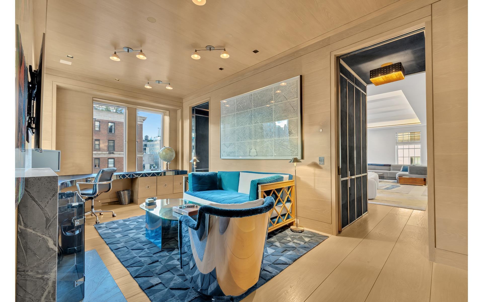 Enter on the 10th floor from a private elevator landing that opens into a glass vestibule which leads to a gorgeous gallery and living room with a wood-burning fireplace and double-height ceilings. An impressive, cantilevered limestone staircase with a floating glass railing is a work of art. It provides a focal point and access to the private quarters on the second level, which can also be accessed via elevator. Beyond the living room is a handsome library clad in ceruse oak with a wood-burning fireplace and wet bar.  The sophisticated dining room is in high design with richly detailed finishes including custom-built cabinetry made from quartered white oak and a luxurious velvet banquette. The chef eat-in windowed kitchen was custom designed and built by Arclinea with top-of-the-line appliances including a Wolf 48" 6 burner cooktop and separate grill, dual Gaggenau combi-stem ovens, oversized Miele refrigerator and freezer, 2 Miele dishwashers, floor to ceiling glass cabinetry, and Thermador wine fridge. The kitchen has a separate custom butler's pantry with massive amounts of storage and a large office area which can also be used as an additional staff room.