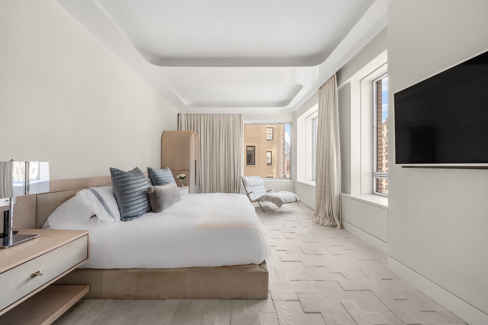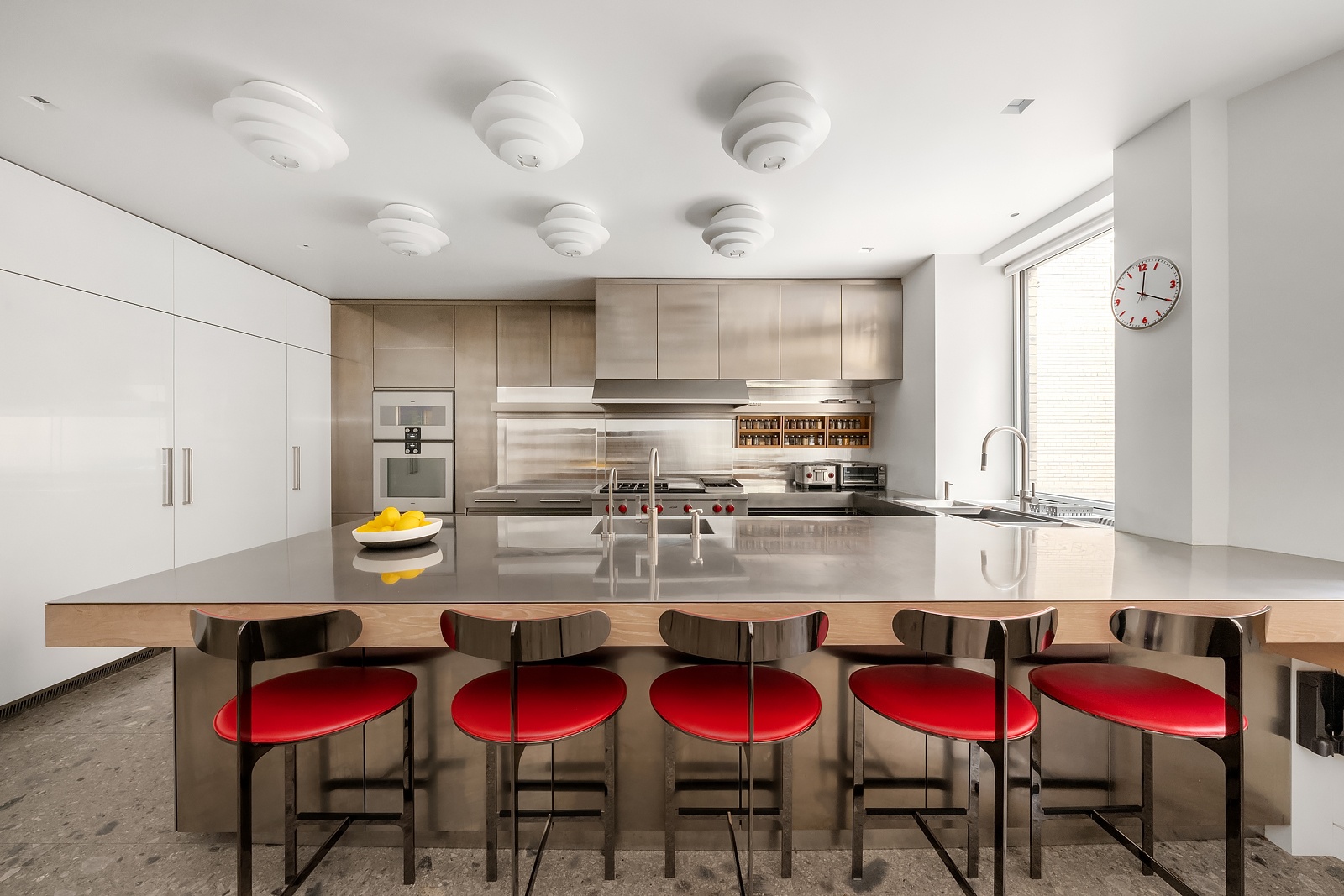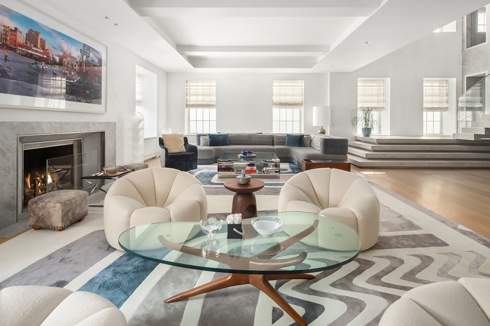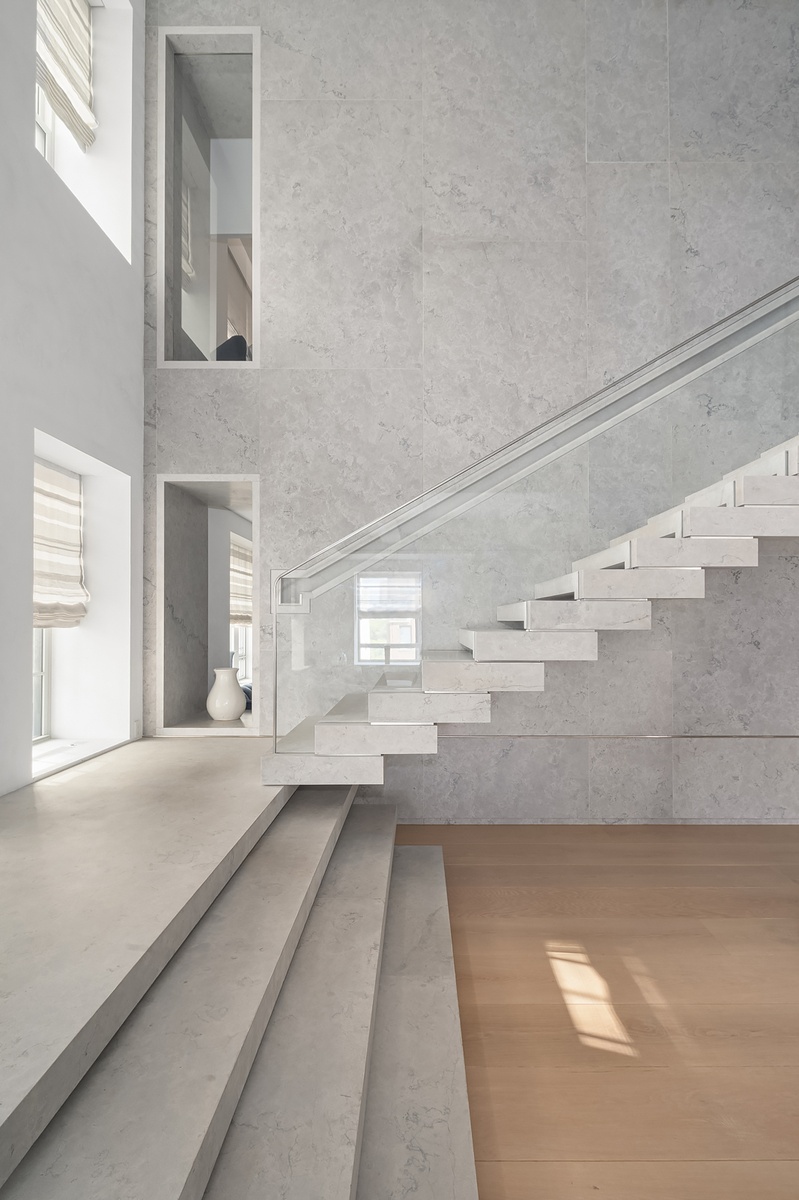 Enter on the 10th floor from a private elevator landing that opens into a glass vestibule which leads to a gorgeous gallery and living room with a wood-burning fireplace and double-height ceilings. An impressive, cantilevered limestone staircase with a floating glass railing is a work of art. It provides a focal point and access to the private quarters on the second level, which can also be accessed via elevator. Beyond the living room is a handsome library clad in ceruse oak with a wood-burning fireplace and wet bar.  The sophisticated dining room is in high design with richly detailed finishes including custom-built cabinetry made from quartered white oak and a luxurious velvet banquette. The chef eat-in windowed kitchen was custom designed and built by Arclinea with top-of-the-line appliances including a Wolf 48" 6 burner cooktop and separate grill, dual Gaggenau combi-stem ovens, oversized Miele refrigerator and freezer, 2 Miele dishwashers, floor to ceiling glass cabinetry, and Thermador wine fridge. The kitchen has a separate custom butler's pantry with massive amounts of storage and a large office area which can also be used as an additional staff room.