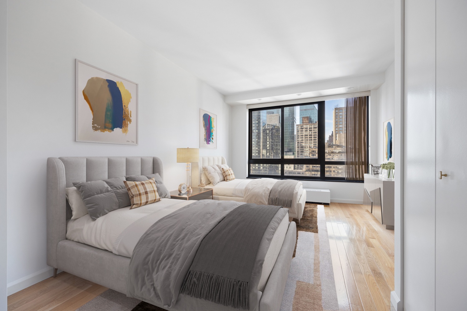Beautifully renovated turnkey 2-bedroom, 2-bathroom apartment located at 100 United Nations Plaza, one of Midtown East's premier white-glove condominium buildings. Apartment 20E features 1,321 interior square feet, 2 private balconies totaling 144 square feet, 9-foot ceilings, floor-to-ceiling windows, a split-bedroom layout, central heat, A/C, and gorgeous oak hardwood flooring throughout.