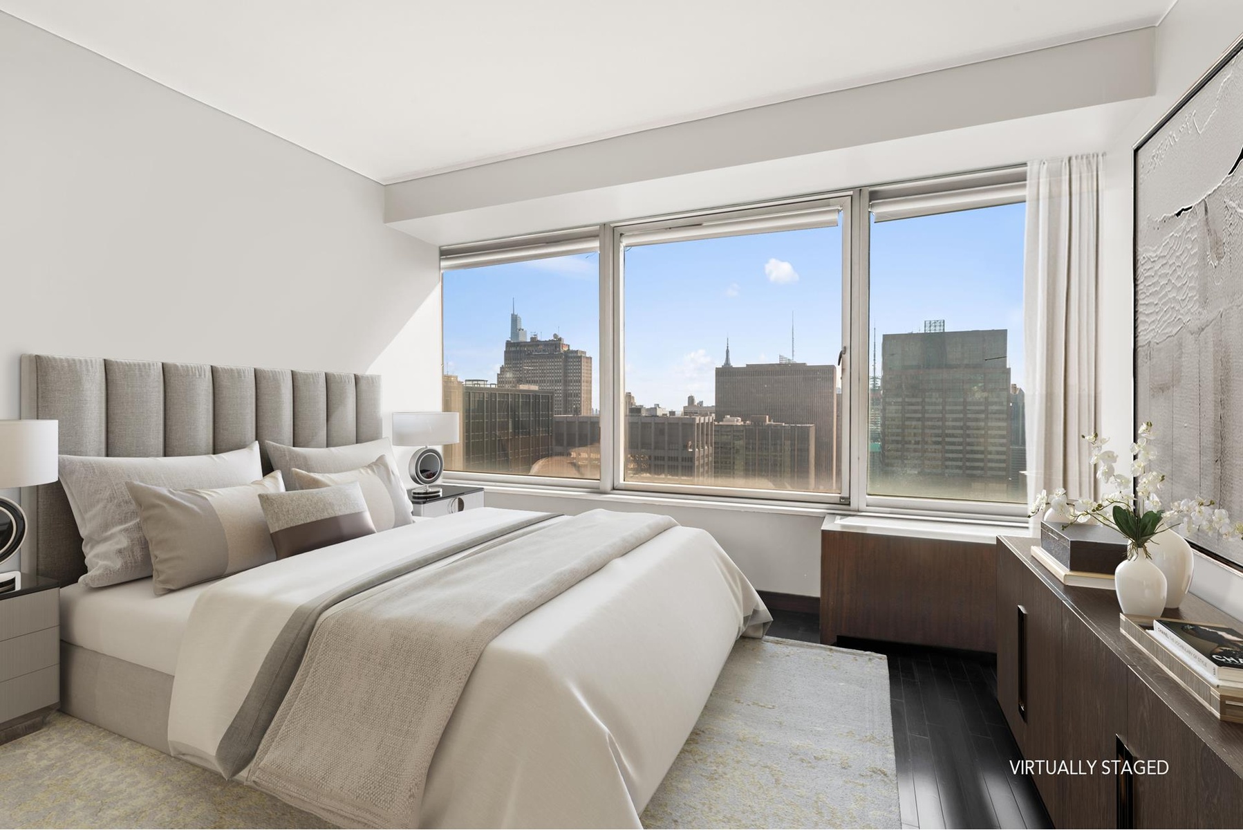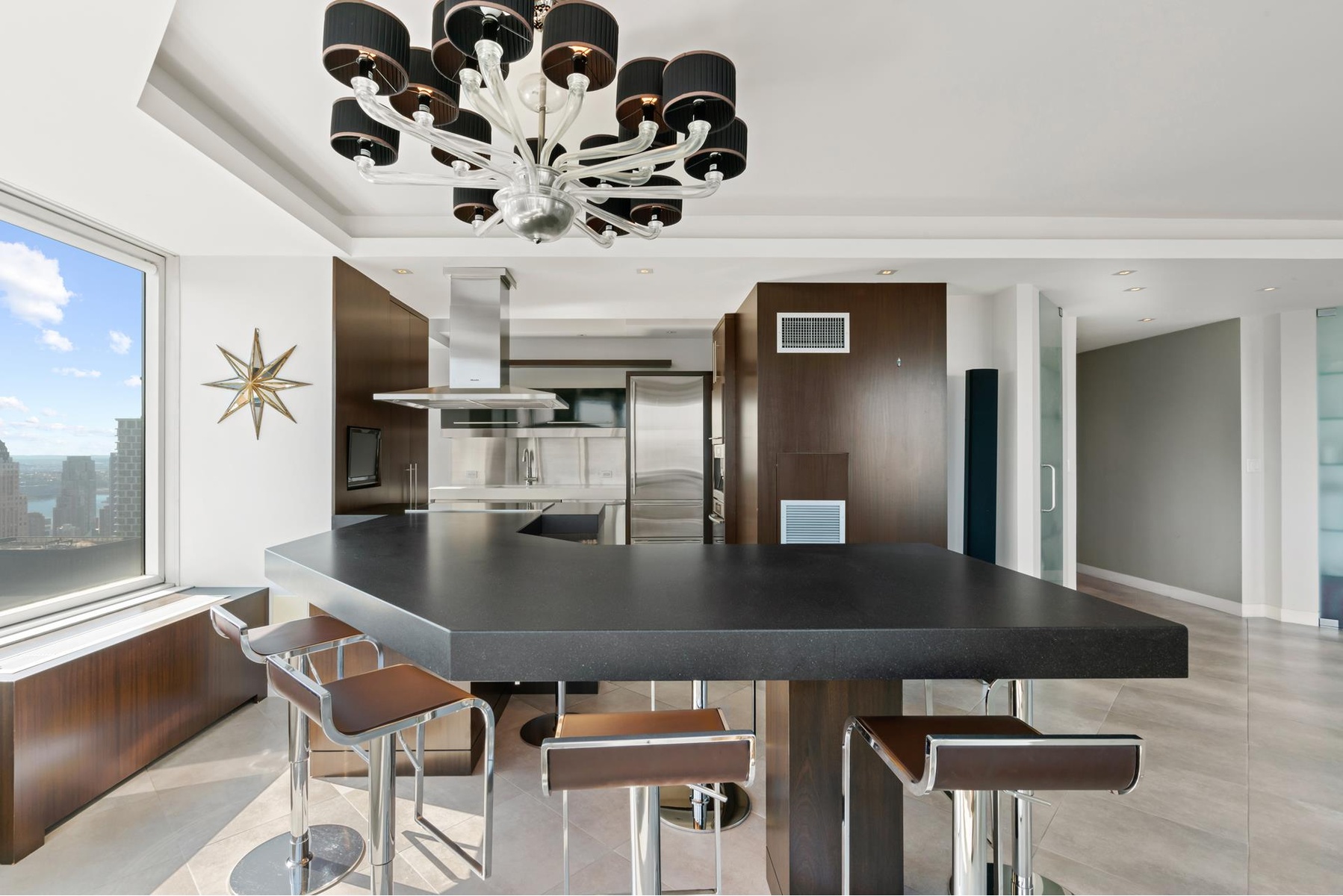 Magnificent two bedroom apartment with spectacular park and city views and state of the art. It is on the 60th floor and has North, East and South exposures. Porcelain tile floors in the living room, kitchen with Caesar stone quartz counter top with bar chairs and top of the line Miele appliances, including electric induction cook top with circulating exhaust fan, subzero refrigerator, dishwasher, wine cooler, built in espresso machine and TV. Both bedrooms have mirage engineered hardwood floors. Two full baths and powder room done in white carrara, lagos blue and avante gray stone, master bath has sauna, shower and Jacuzzi bathtub. Custom made wall panels, closets and doors in sarsaparilla mahogany wood. Luxury full service building with twenty four hour concierge, health club and the pool close to Central Park.