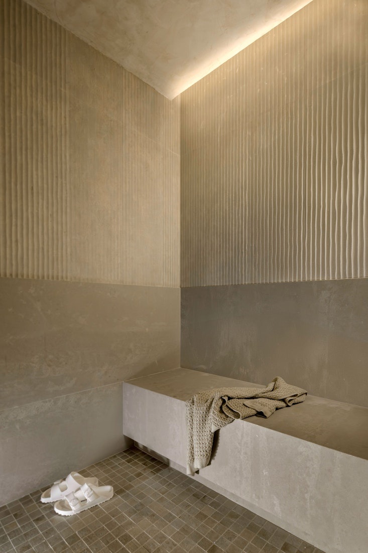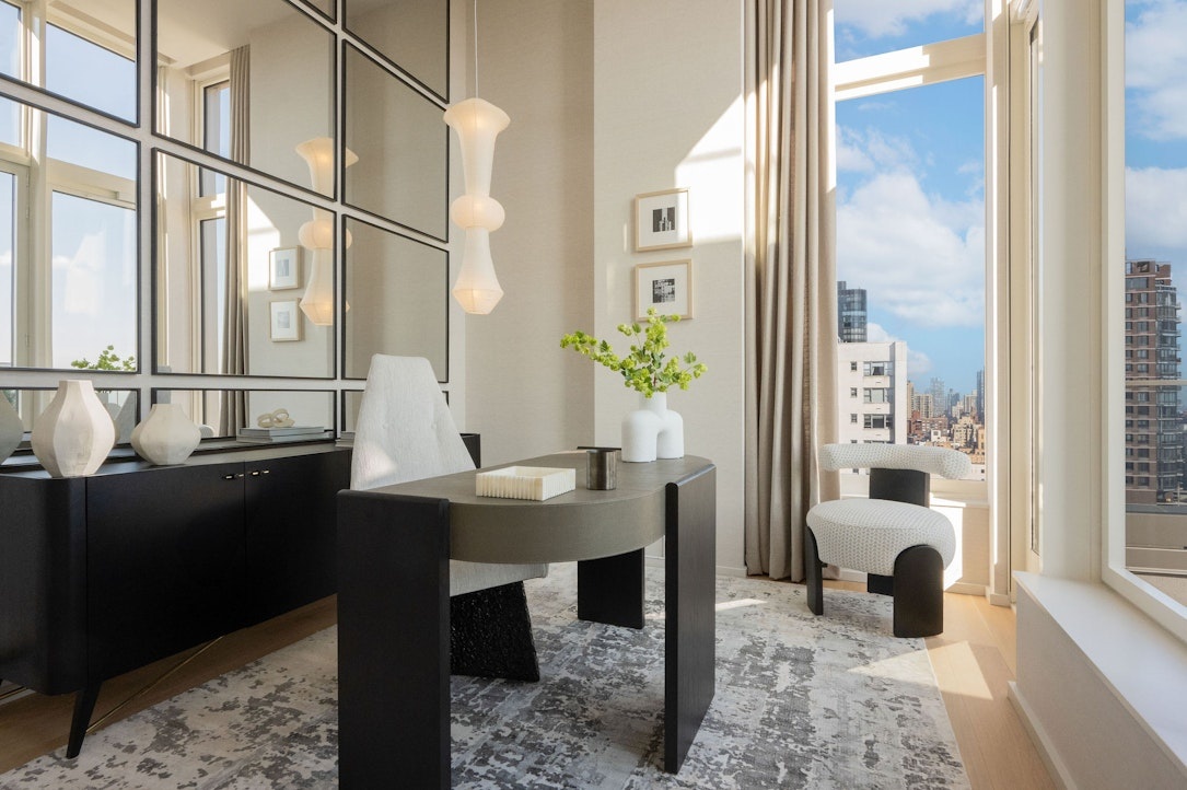 The primary suite occupies the entire northern wing of the residence and includes a gracious bedroom, a private study easily convertible to an additional bedroom, and two terraces, offering unmatched luxury and exclusivity. The primary bedroom provides a haven of comfort and privacy, with west-facing oversized windows framing breathtaking views of Central Park. Luxurious stones such as Honed Bianco Oro marble and cerused oak flooring create an opulent foundation for the primary bath, while radiant-heated flooring and soft ambient lighting add to the ambiance of tranquility.