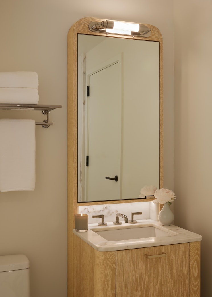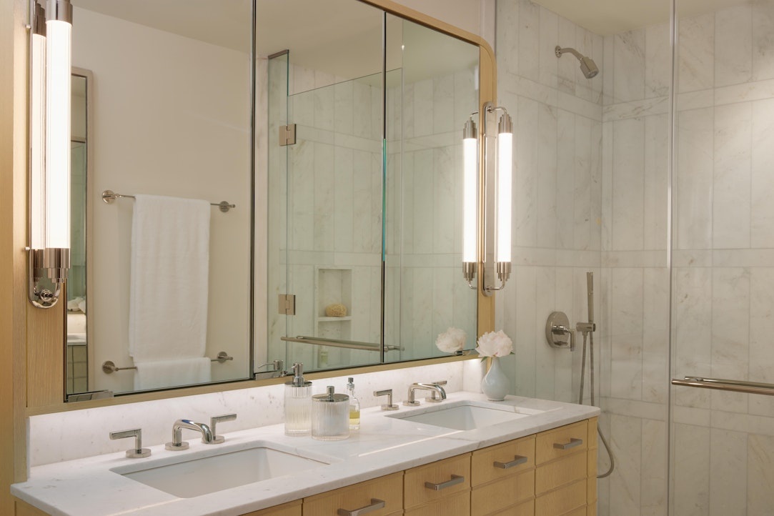 The secondary baths offer a custom cerused oak vanity, Bianco Oro marble, fluted porcelain tiled walls and mirrored medicine cabinet with ample LED lighting.