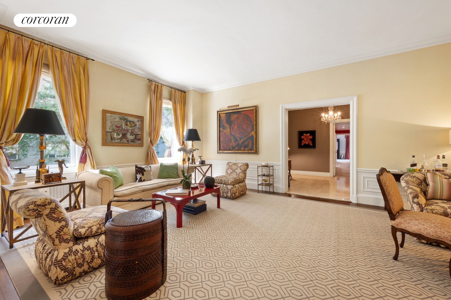 A private elevator landing opens to a very gracious 12 X 11 gallery from which all rooms are accessed. An expansive 24 X 15 living room with 10.5" ceilings is punctuated with a wood burning fireplace and sunny south tree-lined views. The adjacent formal dining room flows seamlessly from the living room and easily accommodates dining and entertaining on a large scale. The windowed eat-in kitchen includes a separate butler's pantry, laundry and corner staff bedroom/media room/den with a full bathroom. A hall off the entry gallery leads to the two bedrooms. The southwest corner primary bedroom suite with direct Central Park views through three oversized windows includes two separate full bathrooms and a large dressing room/closet. The second bedroom suite with windowed bathroom includes sunny south tree-lined exposures. The apartment includes additional storage in the building and all New over-sized picture windows throughout.