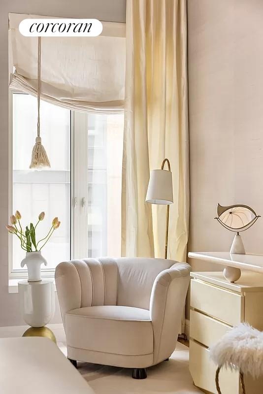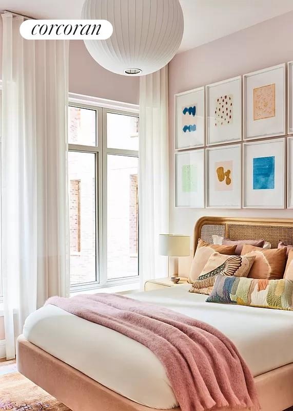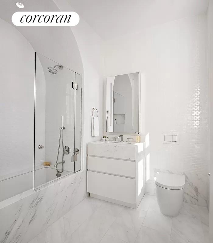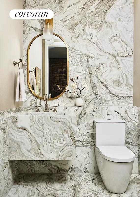 Two secondary bedrooms share an oversized en-suite bath with Calacatta marble finishes, Waterworks fixtures, and a soaking tub. A fourth bedroom or library includes an en-suite bathroom and views over Madison Avenue. The home's powder room is wrapped in honed Italian Burlesque marble with a matching marble sink, countertop and apron. Natural brass mirror trim and pendant lighting completes the unique design.