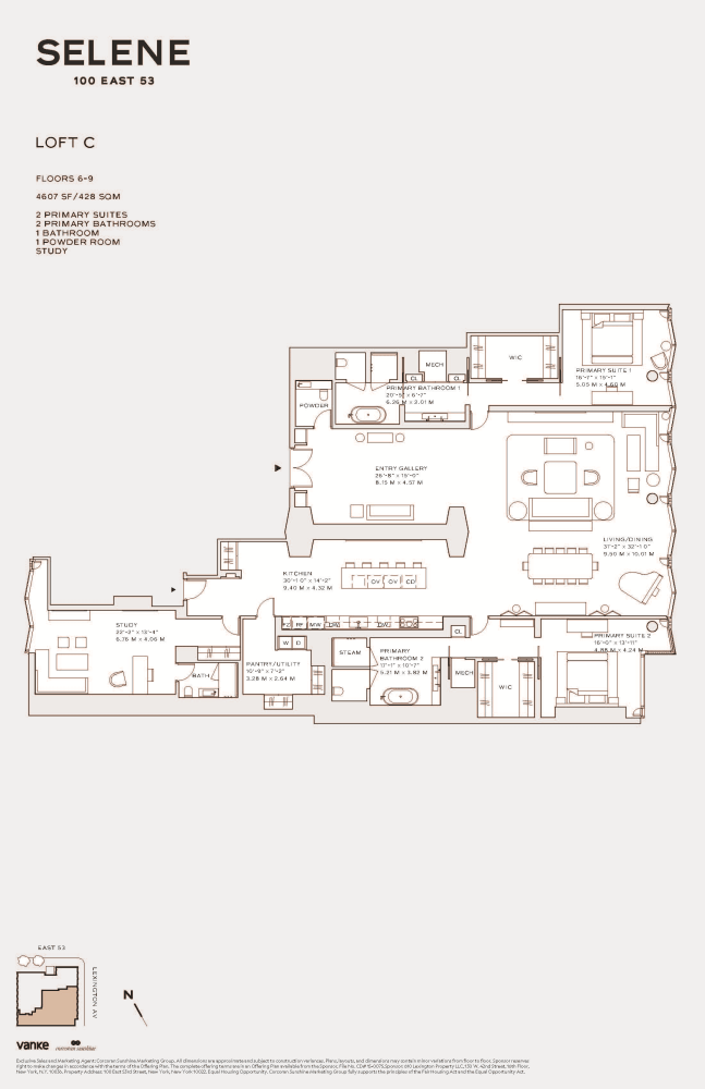 Enter through a set of stately oak doors into Residence 8C, an extravagant 4,607 SF two primary bedrooms plus study, three-and-a-half bath, (convertible three bedroom plus study, currently two plus study) part of a limited Modern Loft Collection of gallery-like residences sited in the podium of the building. This unique home showcases architectural concrete finishes with generous space for art, while maximizing city views with floor to ceiling windows; a rare opportunity for a Downtown loft lifestyle in Midtown. (Alternate floor plan - per the offering plan, amendment 20).