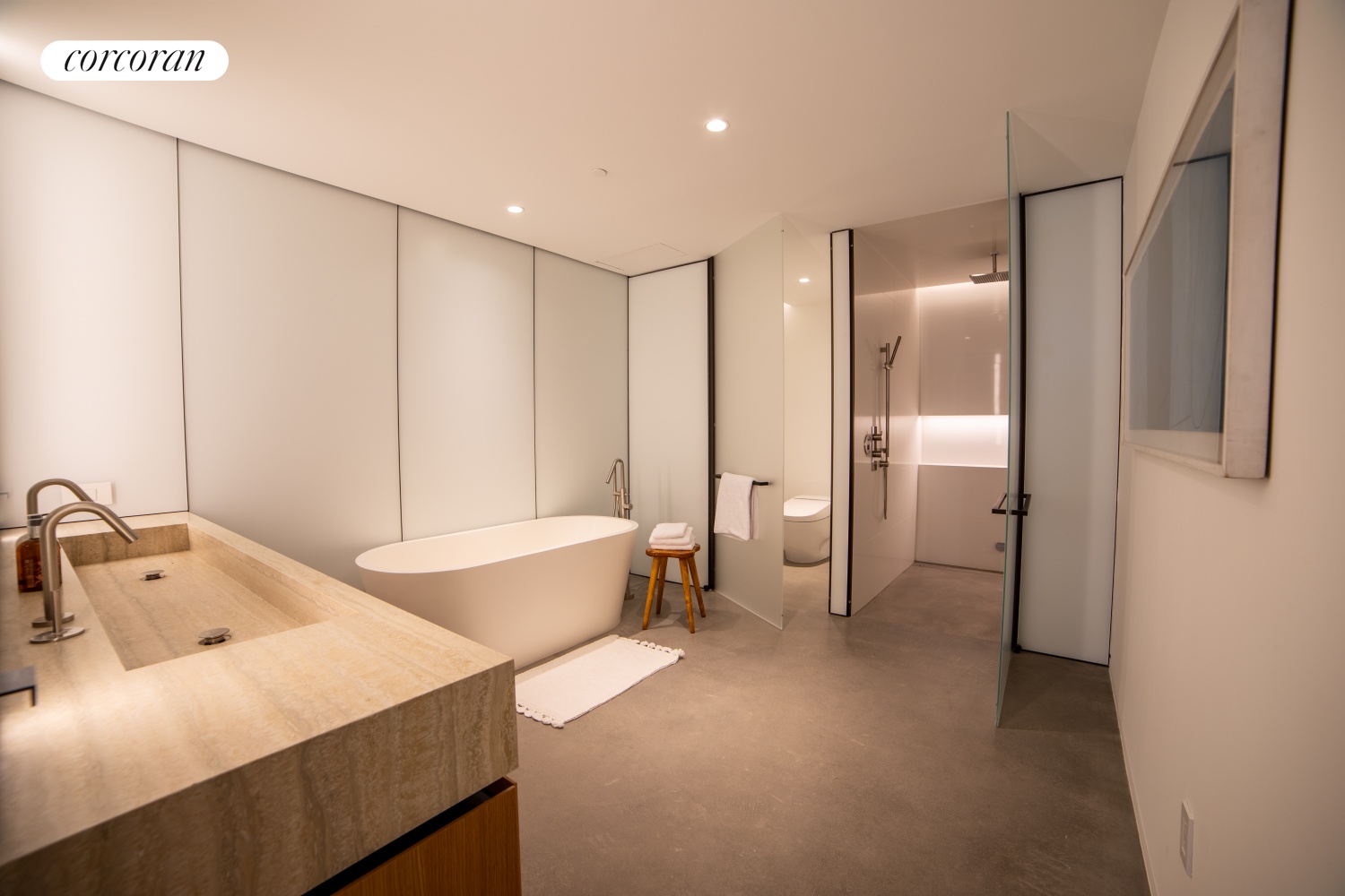 Both primary bedrooms feature an expansive dressing area and a luxurious spa-inspired en suite bathroom adorned with radiant heated concrete floors, a white oak vanity with Silver Striato travertine slab countertop and integrated sink, recessed medicine cabinets with LED lighting, glass-enclosed steam shower, freestanding custom Apaiser bathtub and water closet with Toto Neorest toilet, complemented with Aquabrass fixtures throughout.