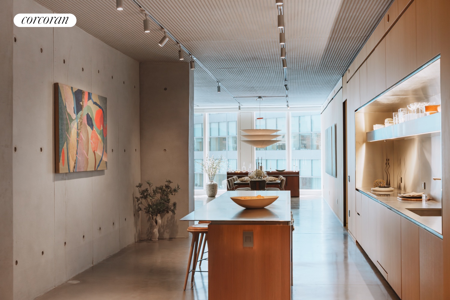 The Foster + Partners-designed open chef's kitchen features white oak cabinetry with integrated pulls and bronze detailing, cabinet-fronted Gaggenau stainless steel appliances, and brushed stainless steel knife edge countertop and backsplash with embedded ventilation and LED lighting - a true culinary delight that allows for seamless entertaining.