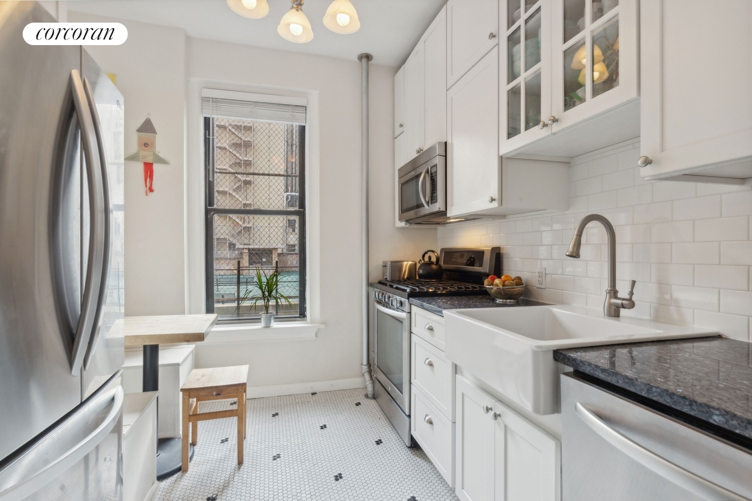 Move right in. Renovated, sunny corner apartment has windows in every room, open city and tree top views, plus east, south and west exposures providing light all day. There is a windowed kitchen with full-size stainless steel appliances including a dishwasher and microwave, tile flooring, abundant custom cabinetry, and an eat-in nook with storage benches. The updated bathroom is windowed and features the original 1906 clawfoot tub. Beautiful turn of the last century details complete this home including original oak flooring throughout, high ceilings, wainscoting and custom moldings, original French doors which amplify the light, and an oak armoire in one of the bedrooms. This flexible space fits your lifestyle whether you want two bedrooms plus home office/ dining room, or prefer three bedrooms, the space can accommodate either scenario.