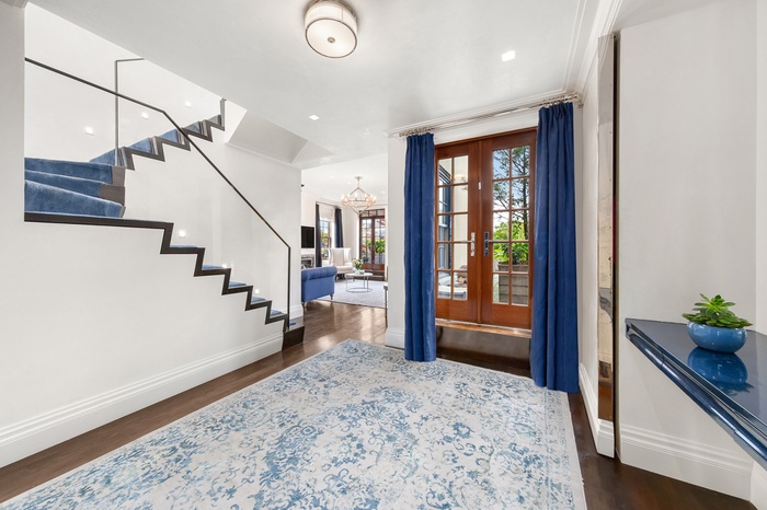 French doors open out to an enchanting wraparound terrace that rings the entire lower level. Stone pavers, wrought-iron fencing, and lush planters frame intimate dining and lounge areas and a charming pergola. Entertaining, alfresco dining, sitting out in the sun, and so much more.
