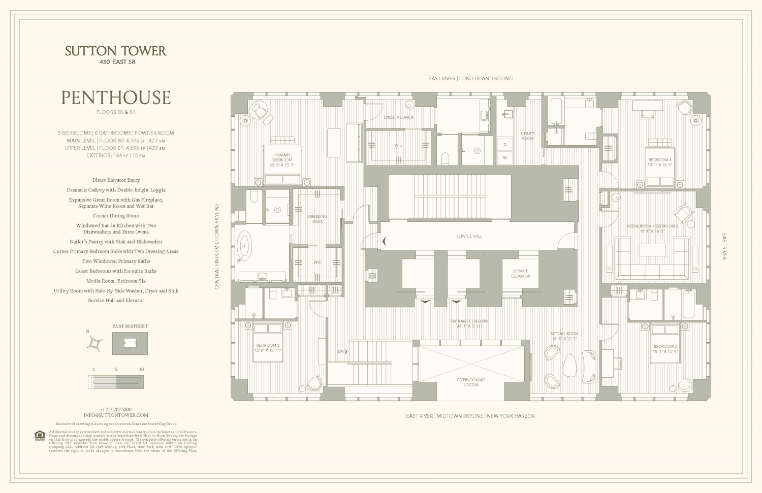 Penthouse 80 is a five-bedroom, six-and-a-half-bathroom residence featuring 9,191 square feet of interior space situated across two full floors, accented by a 166 square foot double-height loggia with southern exposure. Direct elevator entry leads into this expansive home, which offers unmatched views of The Empire State Building, Chrysler Building, New York Harbor, Central Park, George Washington Bridge, and beyond. The dramatic entry gallery leads to a 52'9" x 22'3" great room that boasts 15-foot ceilings and is appointed with a fireplace and wine room highlighted by views to the south, east and north. A northwest-facing kitchen with adjacent great room offers a Statuarietto marble island and Italian custom-crafted matte lacquer white cabinetry adorned with Sub-Zero and Wolf appliances. A formal dining room, butler's pantry, secondary bedroom and elegant powder room highlighted with Fior di Bosco marble complete the first floor.