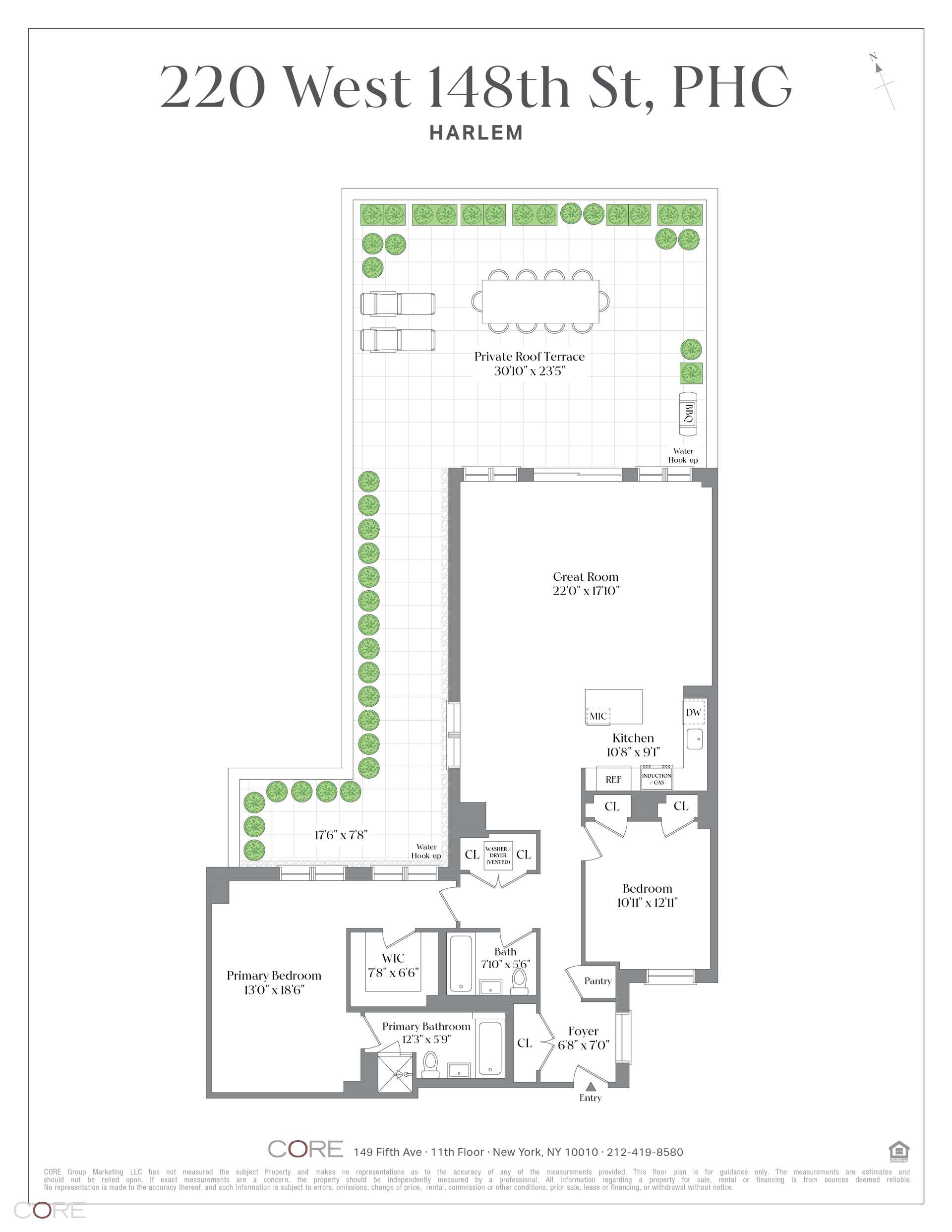 Enter the 1,630 sq. ft. interior through a discreet foyer to a grand great room that offers vast, open-concept indoor-outdoor living. With almost 1,100 sq. ft. of fully landscaped private outdoor space, the terrace is equipped with a grill, lounge chairs, a dining table and chairs, and access to outdoor electricity and water. This exclusive terrace extends the entire length of the home, providing both greenery and privacy. Windows on the north and west walls offer natural light pouring into the kitchen, a formal dining area accommodating up to twelve, and an oversized living area.