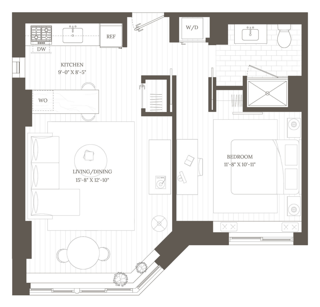 This thoughtfully designed 639 square foot one-bedroom, one-bathroom condominium residence offers southern western exposures with garden views to the south. Each residence features wide-plank white oak flooring, large-scale windows and glass doors, and an in-home Bosch stacked washer and dryer.
