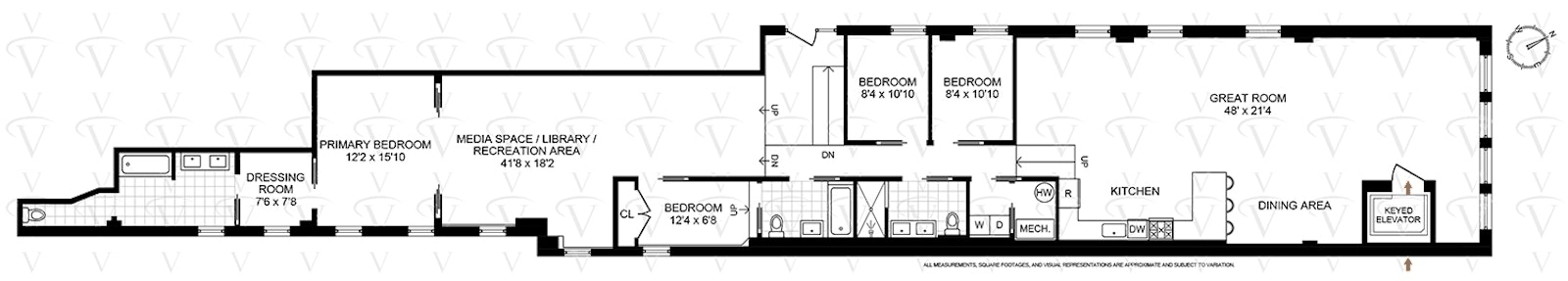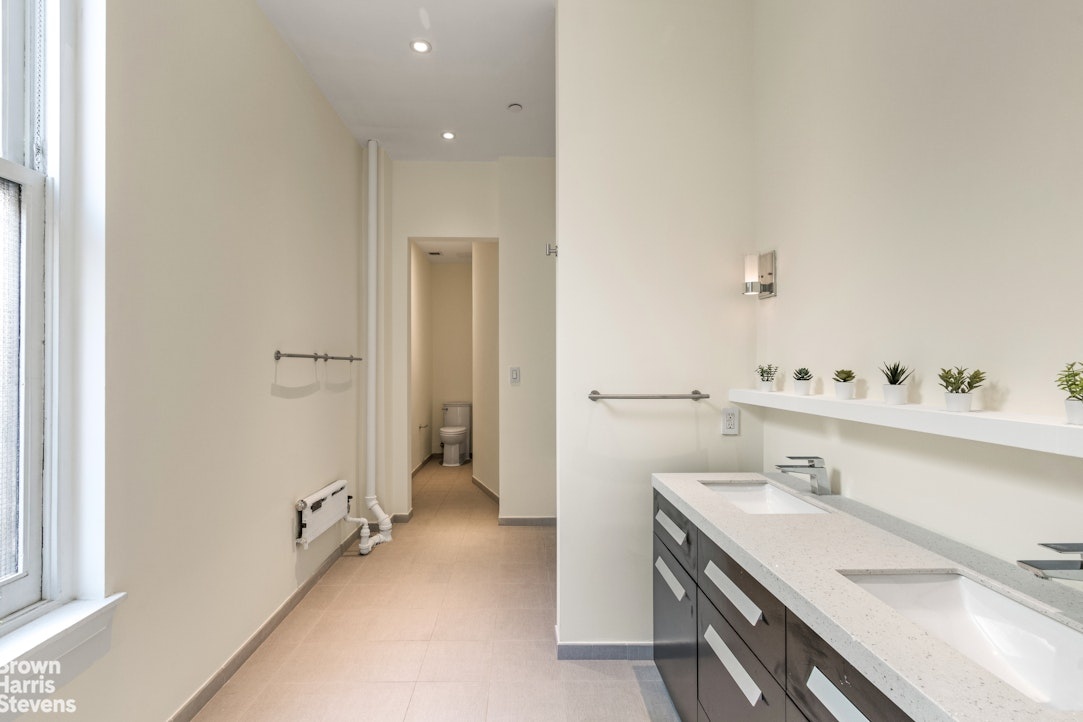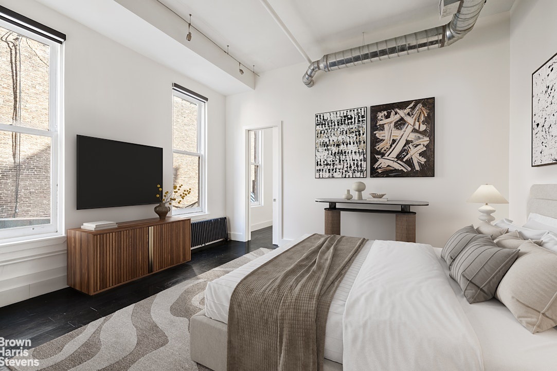 Private keyed elevator opens into a dramatic great room adorned with Northern and Western light. East facing primary bedroom suite is located in the very quiet back of the loft allowing for complete privacy. The second grand area adjacent to the primary suite is a true multipurpose windowed space that can be used either as a media / screening room, library or a home office. Two out of the three bathrooms are configured with double sink vanities. There is a laundry /utility room with your own Bosch washer & dryer and central A/C has been installed.