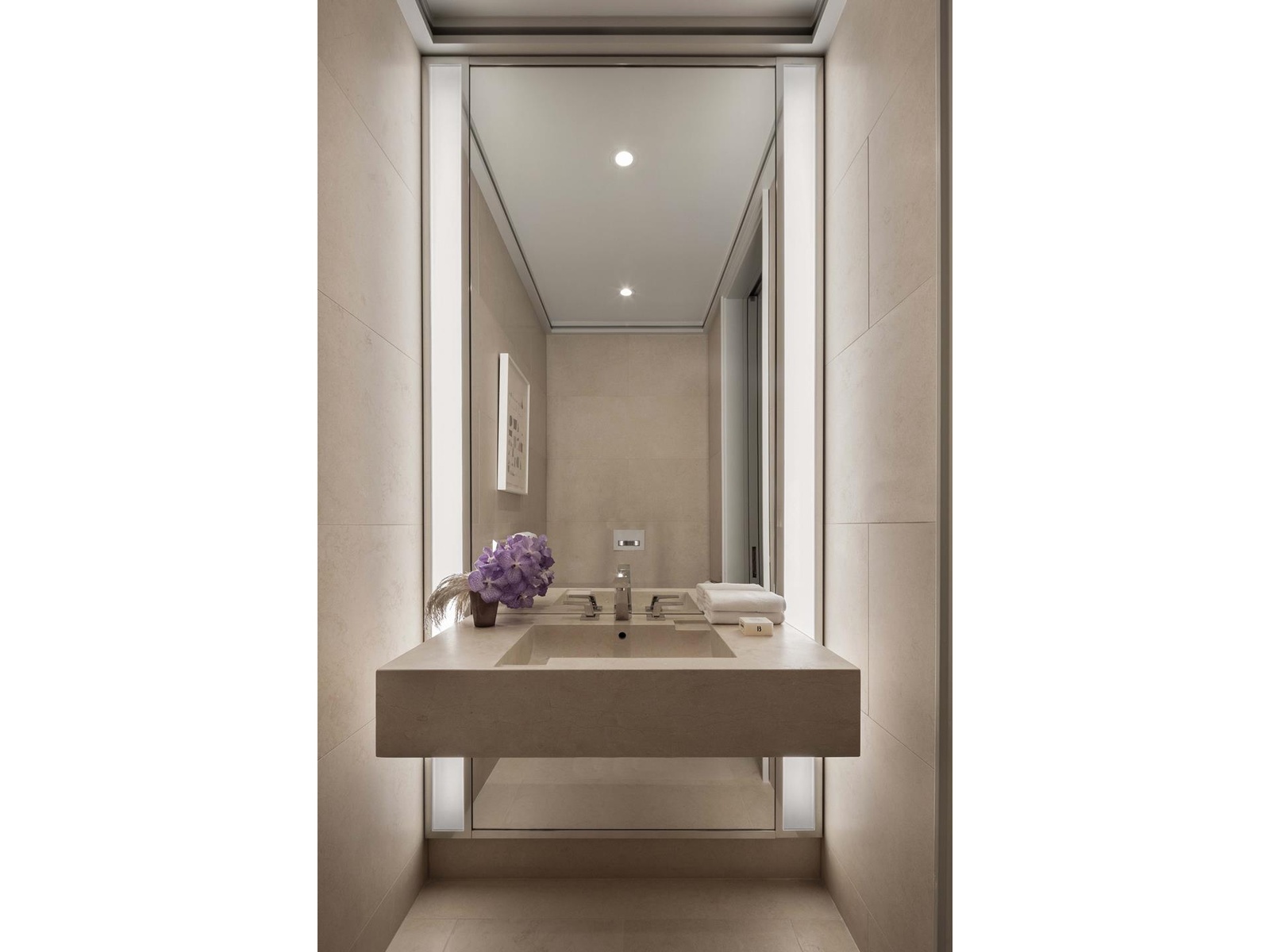 The corner primary suite is a study in grandeur, featuring a bedroom wrapped in three walls of glass to the north, south, and west, multiple closets including an oversized walk-in and a windowed dressing room, and spa-like ensuite bathroom that blends tradition and originality. Elegantly appointed in polished Noir St. Laurent marble, high-honed Verona limestone, and polished Persian golden travertine with polished nickel Dornbracht fixtures throughout, the primary bathroom features two separate custom carved vanities with custom Thierry Despont-designed polished nickel automated mirrors, a cast iron Lefroy Brooks soaking tub, freestanding steam shower, radiant heated floors, private water closet with commode and bidet, and a large linen closet. Three additional bedrooms each offer an en suite bathroom clad in high-honed Verona limestone with polished nickel Dornbracht fixtures. Bedroom Two features bright south- and east-facing views, while bedrooms Three and Four enjoy easterly light. Completing the residence are a beautifully appointed powder room, a discreet utility room with side-by-side washer and vented dryer, and a separate service entrance for the ultimate in privacy. No detail has been overlooked, from the custom interior lighting design by Thierry Despont in collaboration with Schwinghammer, to the motorized Lutron solar shades throughout with additional blackout shades in each bedroom, to the supply of humidified and filtered fresh air throughout the home.