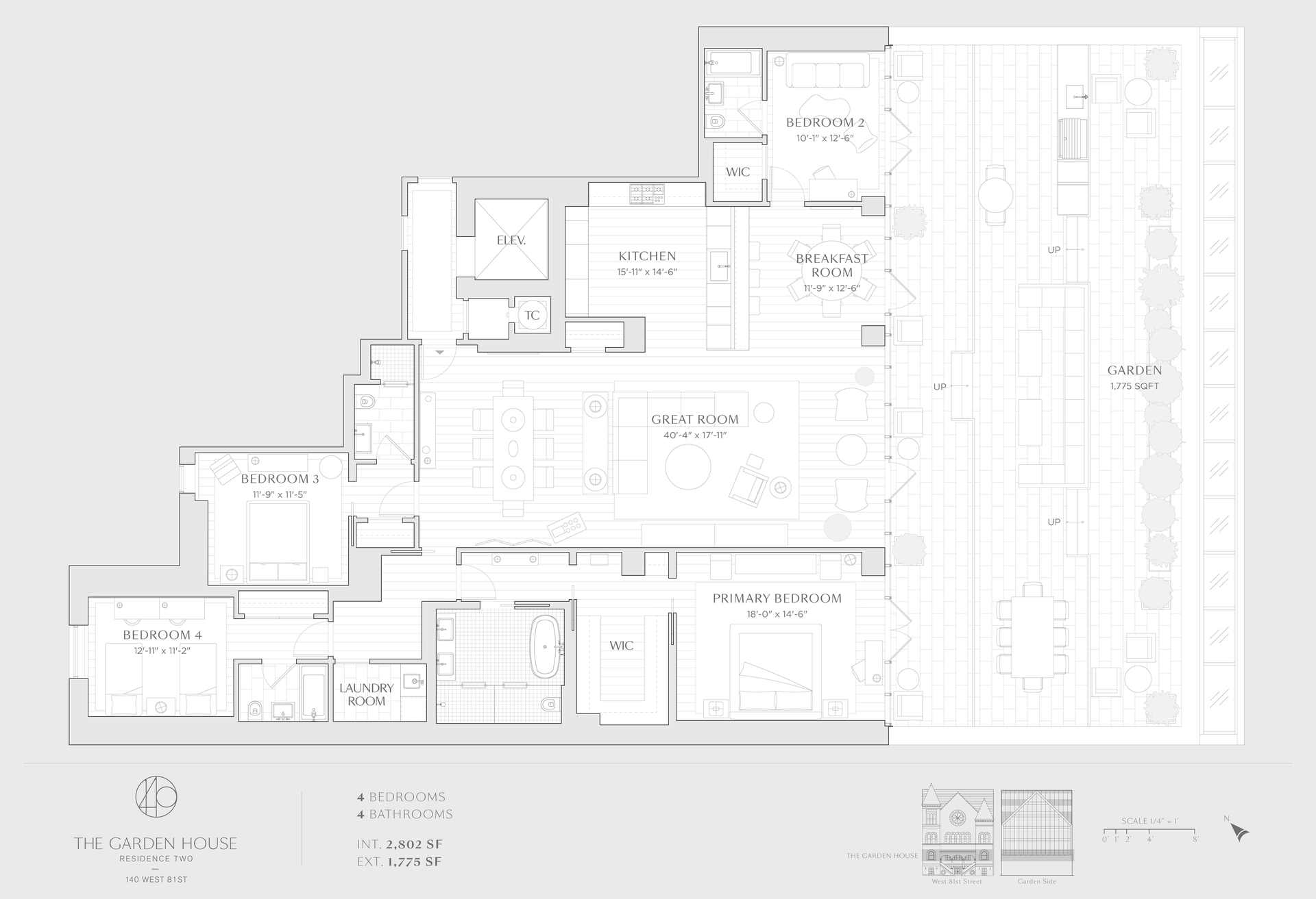 Your own private “park by the park”, this 2,802 sq.ft., four bedrooms and four bathroom home features a 1,775+ square-foot expansive finished terrace, and an expansive chef's kitchen. The Garden House is designed for effortless indoor/outdoor entertaining. Meticulously composed,