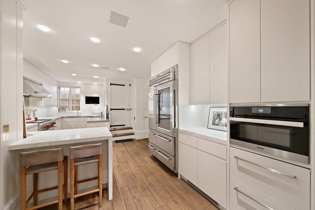 Below, the Garden Floor is also accessible from the street, and features an immaculate white Kitchen and a Great Room with a wood-burning fireplace. With marvelous entertainment possibilities, this room opens seamlessly to an extremely tranquil landscaped courtyard Garden. A Powder Room and coat closet are conveniently accessible.