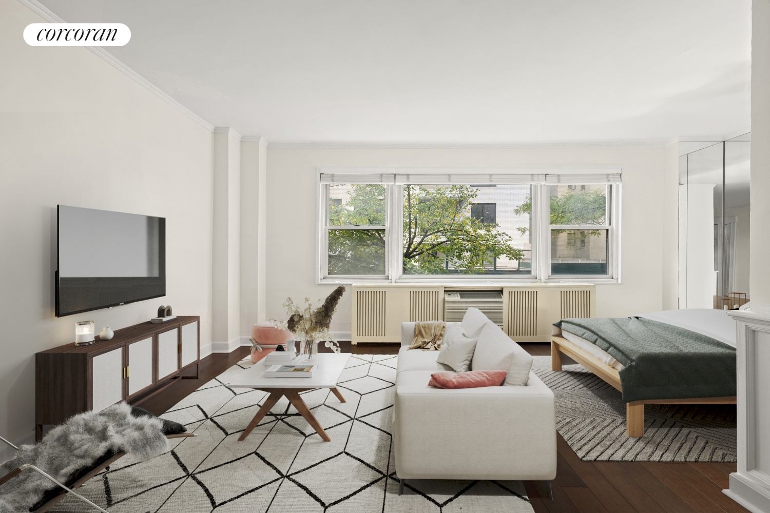 Welcome to 167 East 67th Street, Apt. 2B-a charming alcove studio ideally situated in the heart of the Upper East Side, mere blocks from Madison Avenue and Central Park. With serene tree-top views, this bright and airy studio offers a well-defined sleeping  area, beautiful hardwood floors, and refined details like wainscoting and crown molding that add an elegant touch to the space.