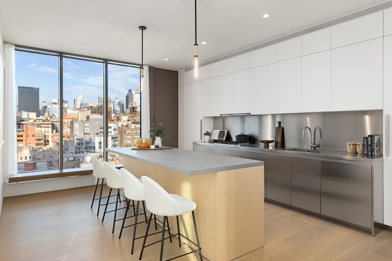The Boffi-designed chef's kitchen features a spectacular floor to ceiling window showcasing northern views of the Empire State building and Hudson Yards. Featuring an oversized stone island, sleek stainless steel countertops, and a suite of high-end appliances including Miele and a Sub-Zero wine cooler, and custom Imported Boffi cabinetry, this kitchen offers both functionality, style and sophisticated design.