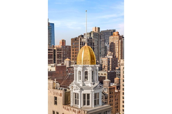 This discreet penthouse, adjacent to the Flatiron building, has been completely renovated, blending true old-world charm with a twist of new development. The entire roof deck is deeded privately, offering a space to marvel at the city. Spanning over 5000 sqft, the residence features an open-concept design with soaring ceilings and windows that frame breathtaking views of the city skyline. The standout feature is the golden dome cupola—a private sanctuary that offers panoramic, 360-degree views of New York City, including landmarks like the Empire State Building, the Flatiron Building and Madison Square Park.