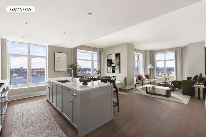 Offering unobstructed views over the Hudson River and Riverside Park, abundant light and air, and an open layout that invites stylish entertaining and gracious everyday living, Residence 29F features three bedrooms, three bathrooms, and nearly 1,800 square feet of elegant living space. This residence is centered on a spacious, L-shaped living and dining room and open kitchen, all offering western sunset views, and includes a primary bedroom with a large 3-panel window, ensuite bath with double vanity, and extra-large walk-in closet. Also facing west is a well-proportioned second bedroom. The third bedroom occupies its own wing, with an ensuite bath that maximizes privacy.