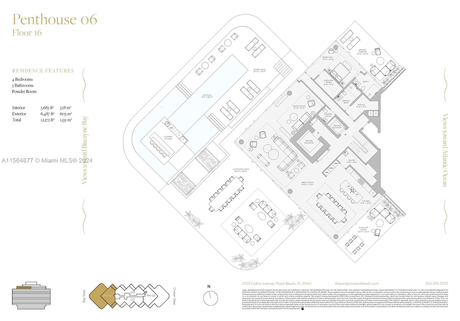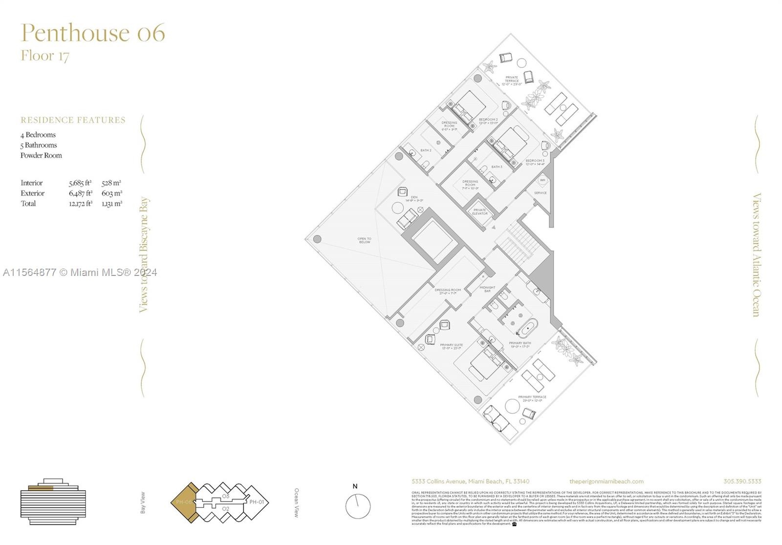 Rising from the most peaceful and expansive stretch of sand on Miami Beach’s coastline, The Perigon is an unprecedented collaboration between three global design icons. The rare seclusion, matchless amenities, and impeccable service of this unique private enclave promises residents an exclusive Miami Beach lifestyle.This PH 4 bedroom residence with over 5685SF of living space and 6487SF of terraces makes this one of the best PH options on the market. Buyer chooses - Kitchen cabinets, flooring options, closets installed - Developer inventory is subject to change based on activity of sales. Gas cooking, Wolf & SubZero appliance, stone countertops Parking is self park or valet park (owners choice) - Contact the Sales Gallery to learn more about the finest new building in Miami Beach.