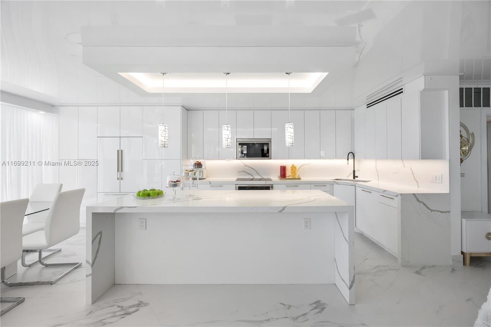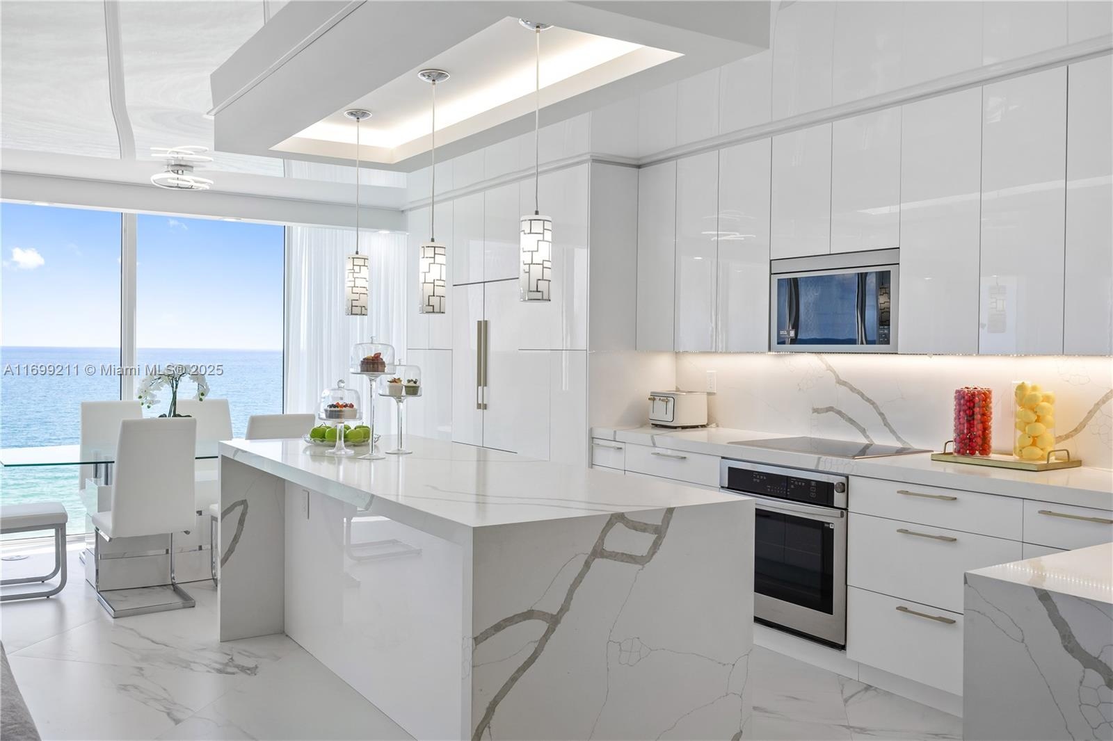 Bask in the direct ocean view from this completely remodeled 3 bedroom, 2.5 bath residence. Entertaining is a pleasure with this open concept floor plan, a large kitchen island, plentiful custom cabinets, quartz countertops, Bosch coffee station and stainless sink. Some of the designer finishes include 48"x48" white/grey matte porcelain tile, stretch ceiling, high gloss white cabinets with goldtone cabinet hardware, LED lighting and electric curtains and blackout shades. All windows and sliding doors are hurricane impact glass. New A/C ducts, vents and a powerful 4 ton HVAC. Unit is being offered turnkey. The Oceania community features an amazing health club & spa, full service private beach club, fitness classes, racquetball, 2 oceanfront dining rooms, tennis, marina and more!