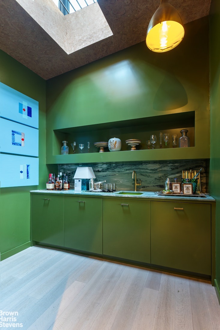 A wood-burning fireplace with a Vatican-style surround anchors the room, while glass-block partitions subtly separate a wet bar finished in sleek Green custom cabinetry. Original triple-bay steel casement windows frame cinematic Village views, and a 15' 22' south-facing terrace completes this peaceful aerie above the city.