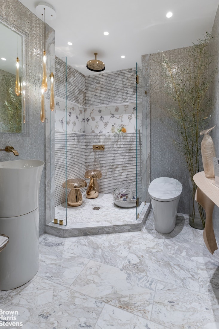The proposed fourth floor primary suite enjoys open exposures, protected views, and a 12x15 private terrace, complemented by 1.5 baths including a spa-like bath with an oversized glass-enclosed shower, gold fixtures, and a smart Kohler toilet. Views extend across the neighboring Church of the Village, and surrounding private art collections, creating a rare sense of privacy and calm.