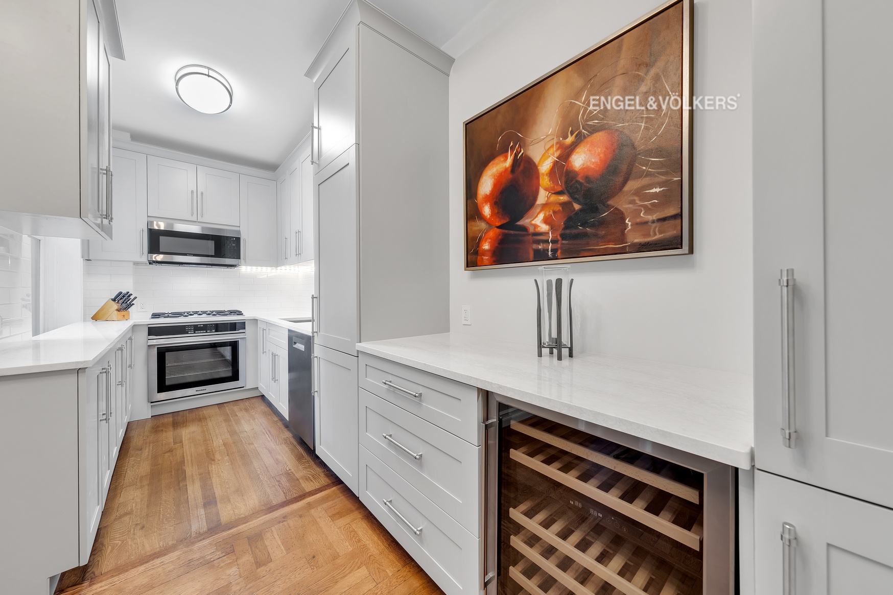 The expansive living room features an 18' custom built-in cabinet and an AV closet, perfect for modern entertainment needs. Brand-new windows usher in natural light, complemented by refinished oak floors throughout. The dining area boasts stylish new cabinetry and a wine cooler, offering a sophisticated space for entertaining. The entirely new kitchen combines style and function, featuring state-of-the-art appliances, custom cabinetry, quartz countertops, and a beautifully tiled backsplash.