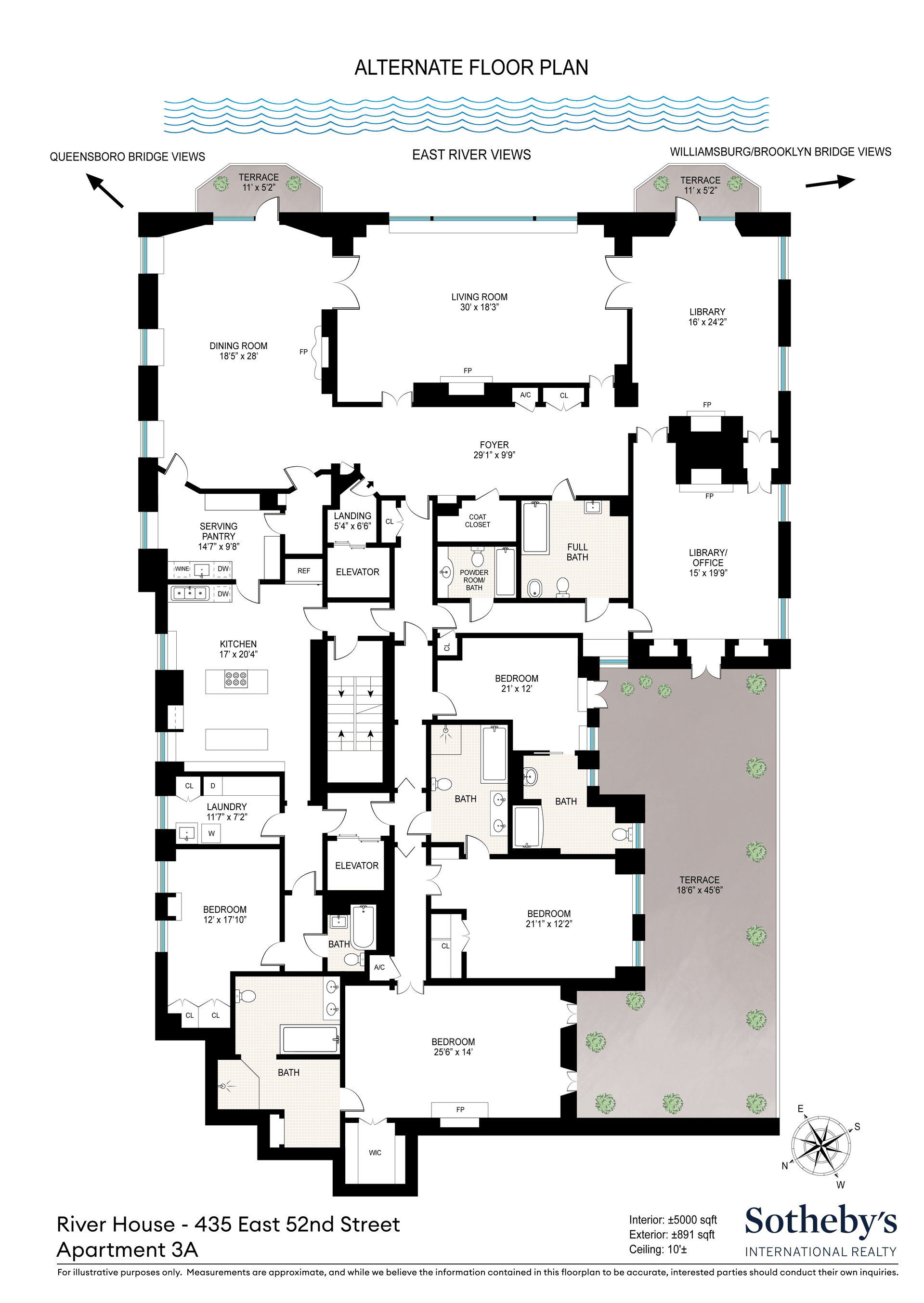 Apartment 3A is a grandly scaled 12-room home offering approximately 5,000 square feet of interior and nearly 890 square feet of outdoor space. It is ideal for those in search of generous outdoor space with its two ~l 1'x5' river-facing breakfast terraces- one off the dining room and the other off the primary bedroom- and its even more spectacular 18x45' river-view terrace which is currently accessible from four different rooms and where one can comfortably host tea for two or drinks for one hundred. These large user-friendly outdoor spaces offer a tranquil water-view oasis rarely available in a venerable New York co-op!