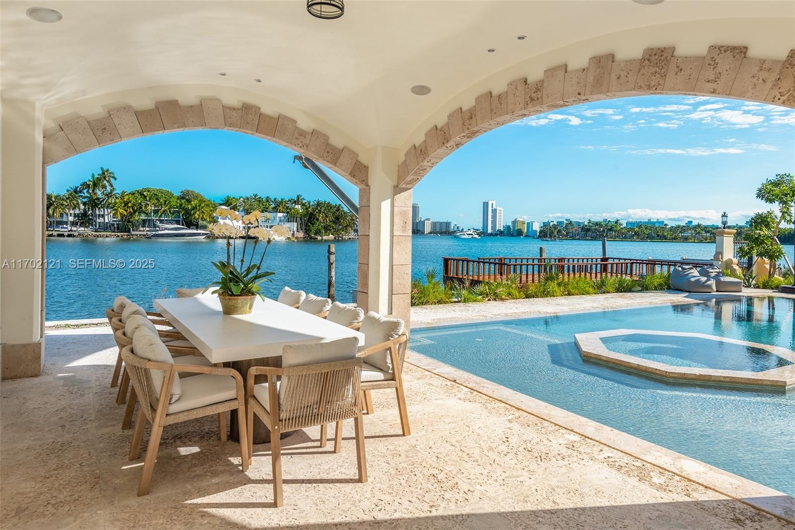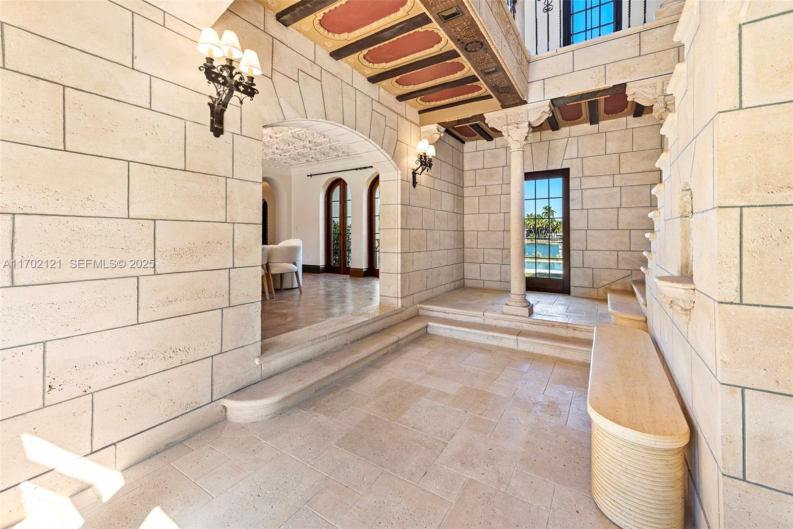 Perfectly nestled in the estates of Palm Island, a Mediterranean marvel with over 15K total SF of living space has been masterfully restored. Maintaining original architectural features, the estate boasts modern, state-of-the-art amenities + technology. Sprawling over 30K SF of lush grounds with exotic trees, fountains and 100’ unobstructed waterfront, multiple scenic outdoor lounging+entertaining areas abound,including a rooftop and private deck over the water. The mansion offers 6beds 7/2bths, office, insolated movie theater, grand saloon, formal dining, cognac rm & art gallery. Chef's kitchen features 3 Wolf gas ranges+Subzero appl, enormous island, family room and 2nd dining. The guest villa has a Turkish hammam/sauna, jacuzzi,massage+gym. 2nd fl 3/2.5 living/dining/kitchen 2 elevators