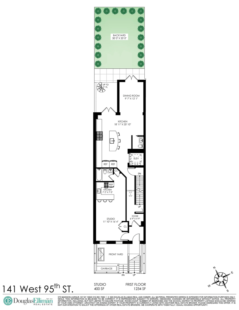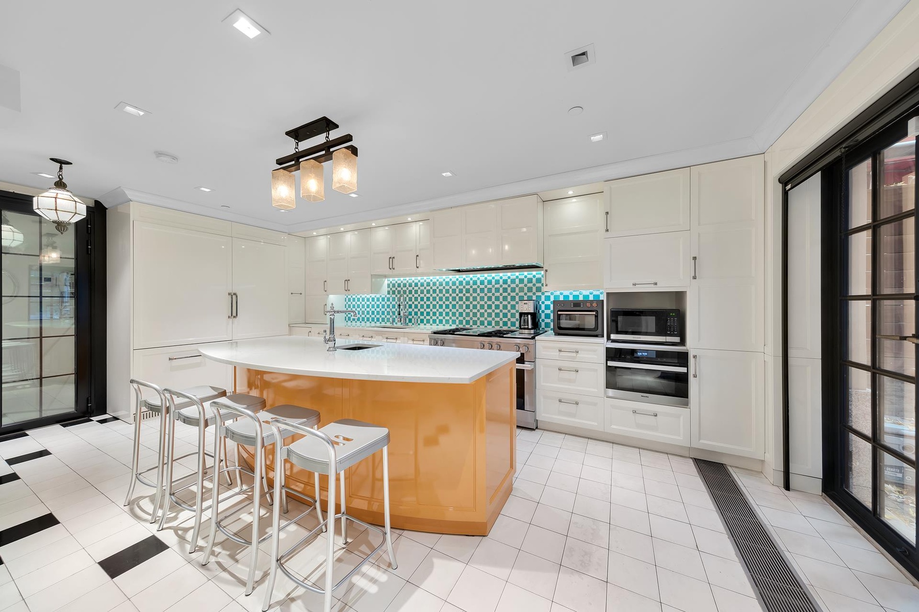 On the garden level you will find a glorious kitchen and dining room opening to the beautifully landscaped garden of approximately 600 square feet. The stylish kitchen enjoys acres of counterspace, a large island in whimsical canary yellow, beautiful custom cabinetry and chef's appliances. The kitchen is open to a stunning modernist dining room with room for 10-12. The kitchen also leads to the stunning back yard, the ultimate luxury in the city, replete with custom sculptural steel pergolas and a gorgeous outdoor kitchen. Also on this level is a convenient powder room and a large, private suite with kitchenette and full bath which can be accessed from the hallway or an "under the stoop" entrance, which can serve as a private office, guest suite or rental studio.