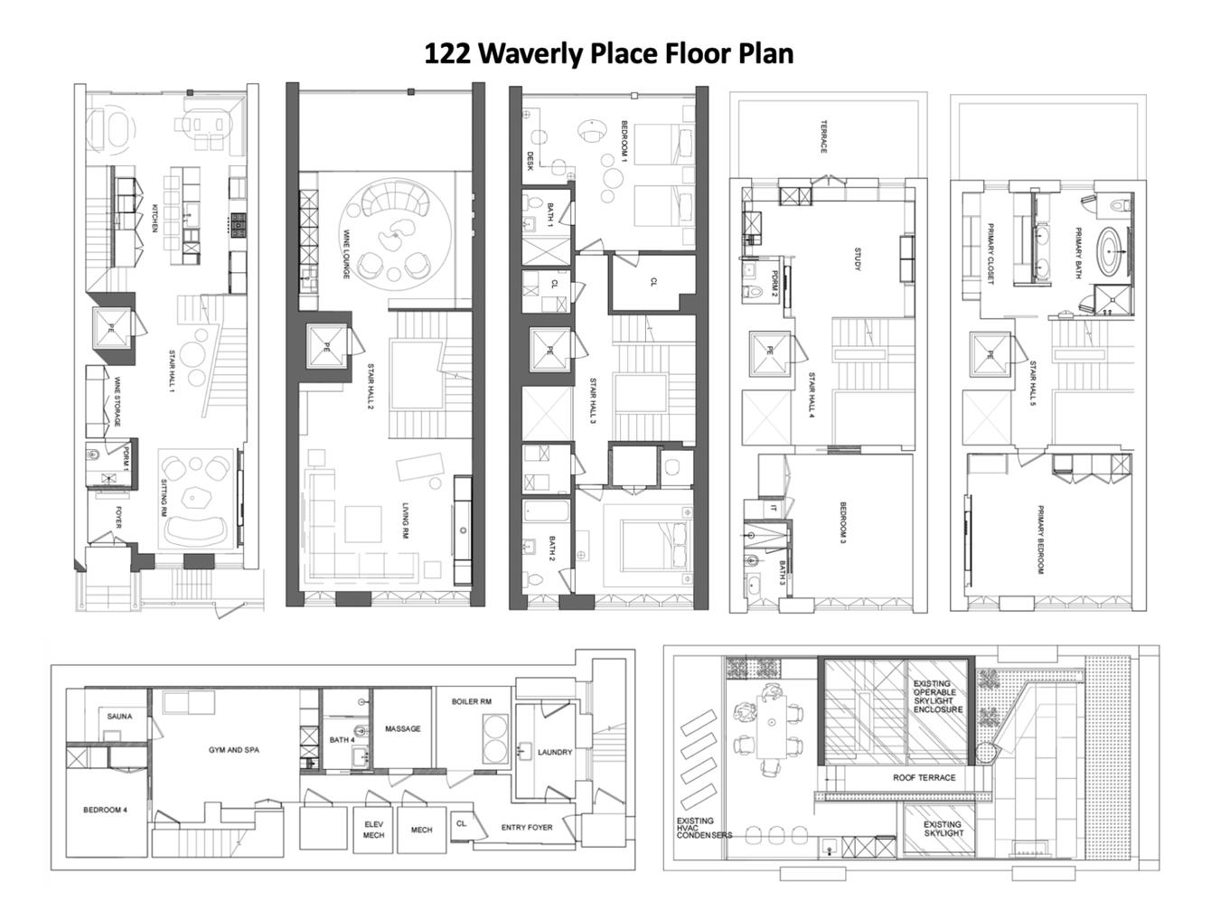 Welcome to 122 Waverly Place, an exquisite masterpiece that exudes luxury in every detail across its 5 grand-scale levels, encompassing approximately 7,310 sq. ft. Nestled on a historic, tree-lined block, this meticulously designed gut-renovated home captivates with 3 extraordinary outdoor spaces, totaling approx. 1,925 sq. ft. Light reigns in every room, flooding from two fifth-floor skylights illuminating the center of the home.