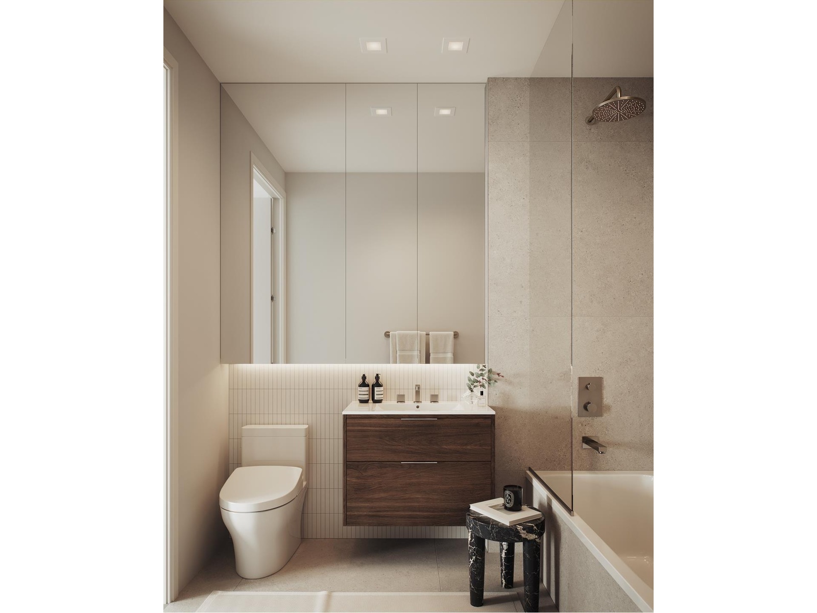 BATHROOMS fitted with stone Masai Blanco 40" floor tiles and matte white wall tiles, custom 30" vanities, expansive mirrored medicine cabinets, brushed nickel Phylrich contemporary faucets, neptune Entrepreneur Albana bathtubs, Artos brushed nickel bath, shower, towel bar, and paper holder fixtures and a lcera Museii toilets with Iwash electronic bidet.