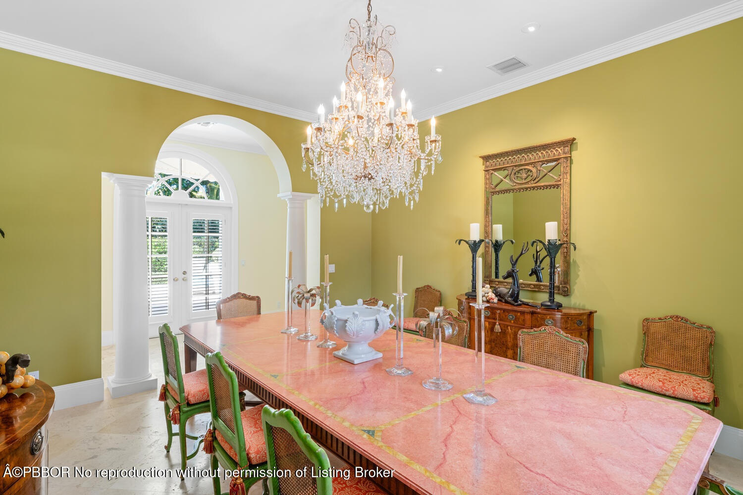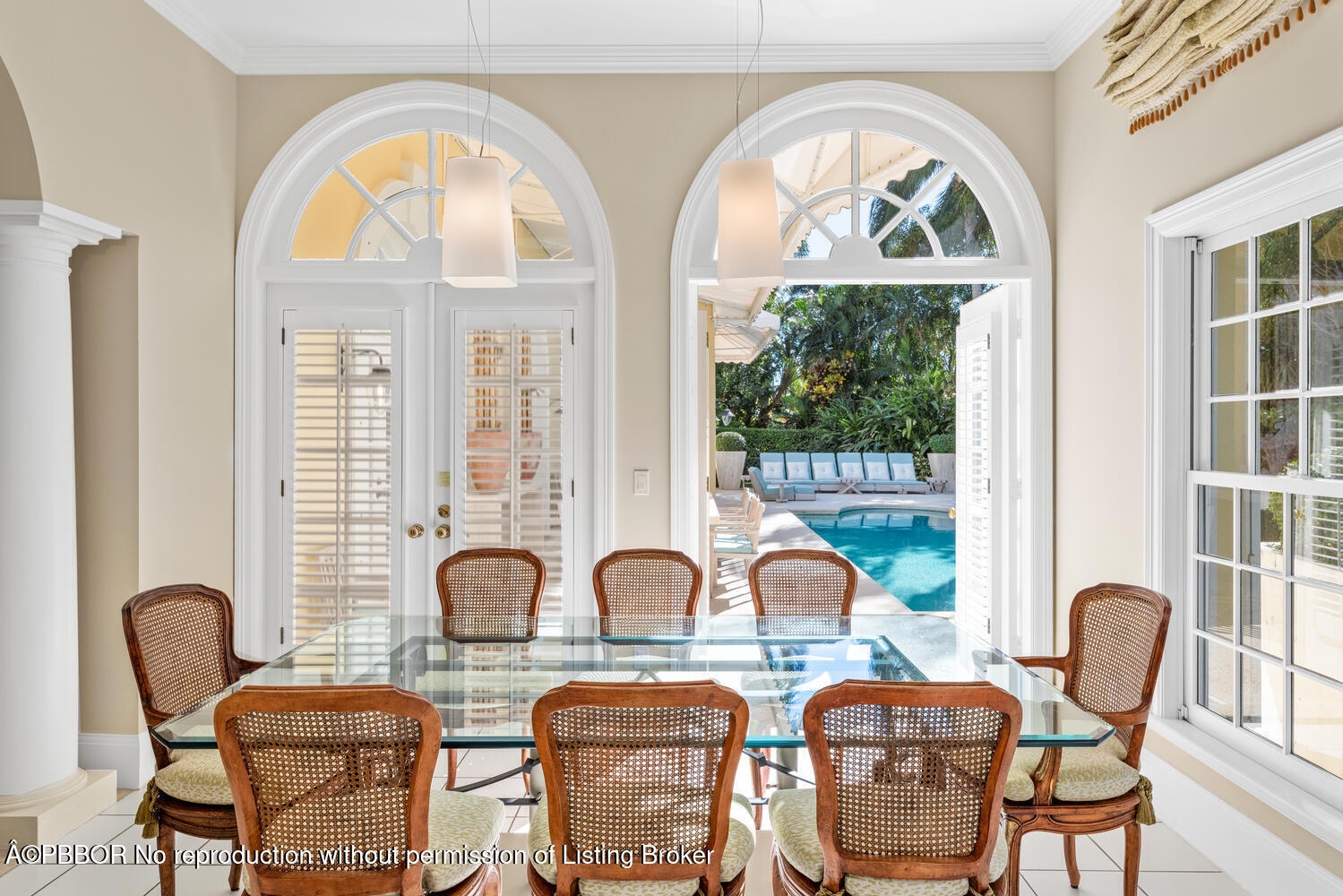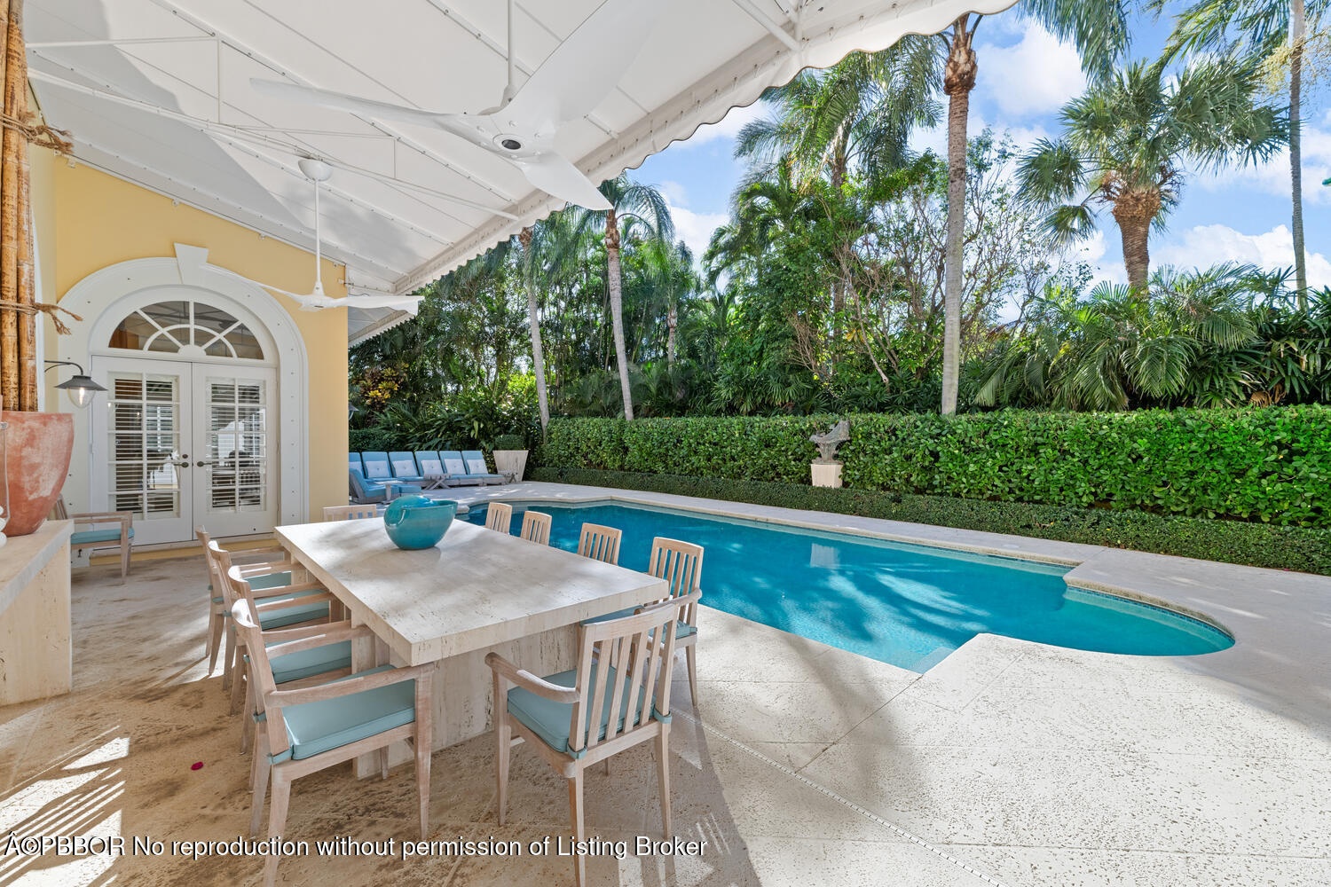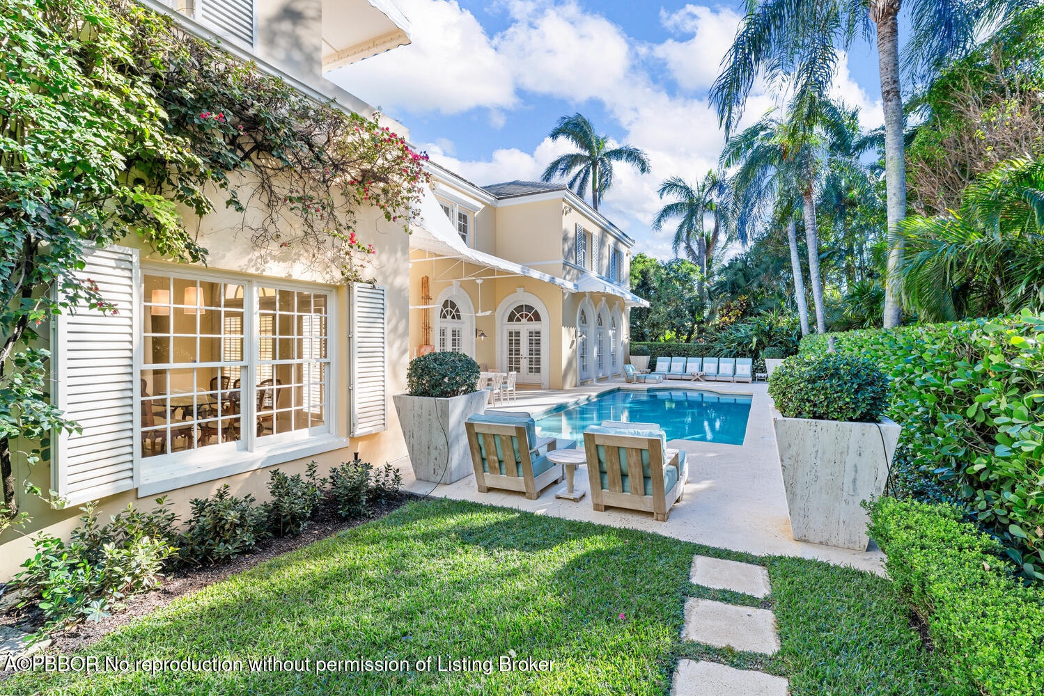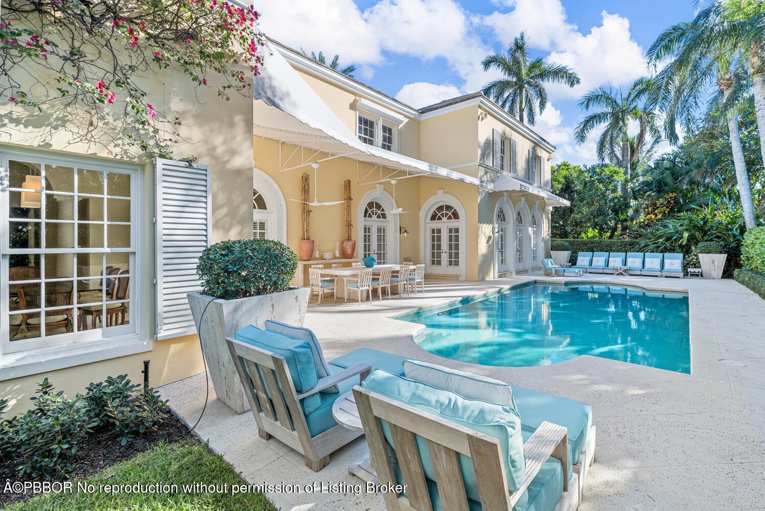 This British Colonial residence offers 6,922± total square feet with five bedrooms and six and a half bathrooms. Set on a 100' x 172' lot at the corner of Tangier Avenue and North Lake Way, the property features a large pool, covered loggia, and beautifully maintained grounds.