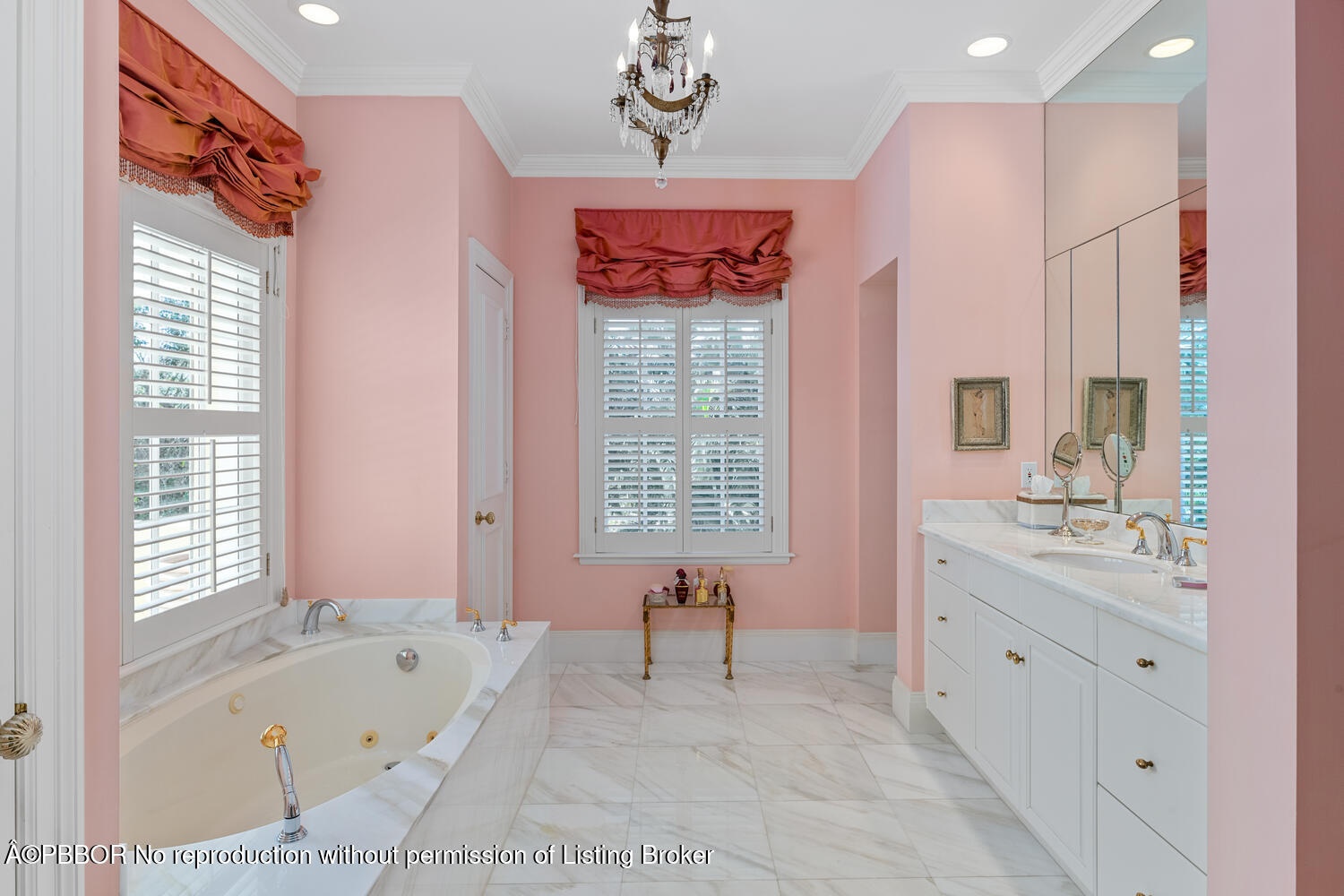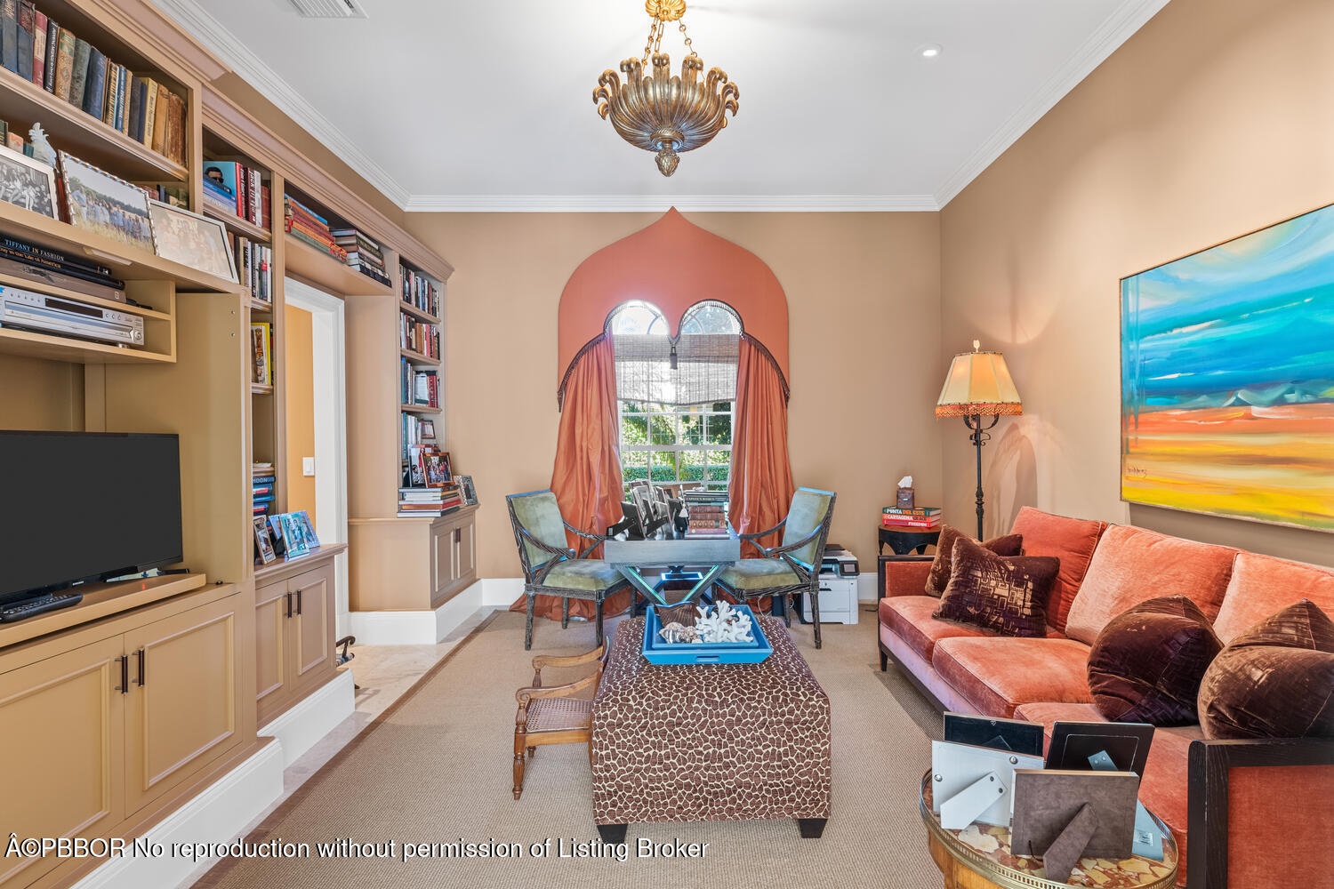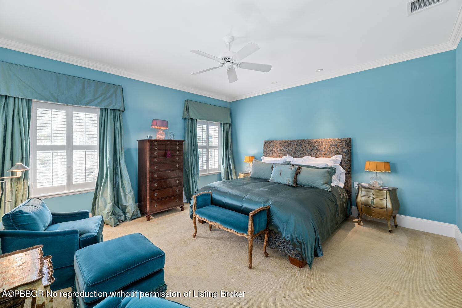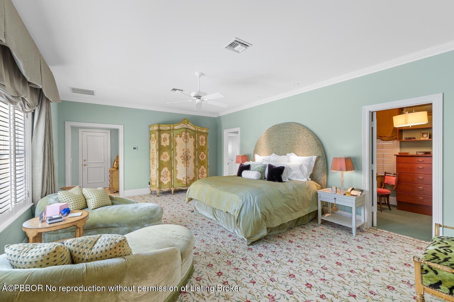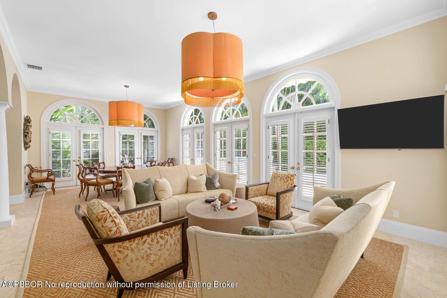 This British Colonial residence offers 6,922± total square feet with five bedrooms and six and a half bathrooms. Set on a 100' x 172' lot at the corner of Tangier Avenue and North Lake Way, the property features a large pool, covered loggia, and beautifully maintained grounds.