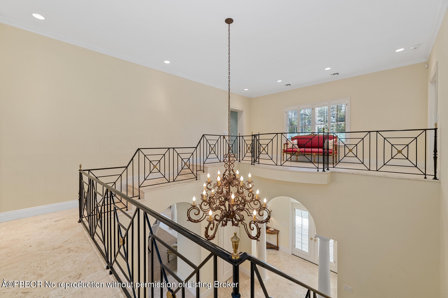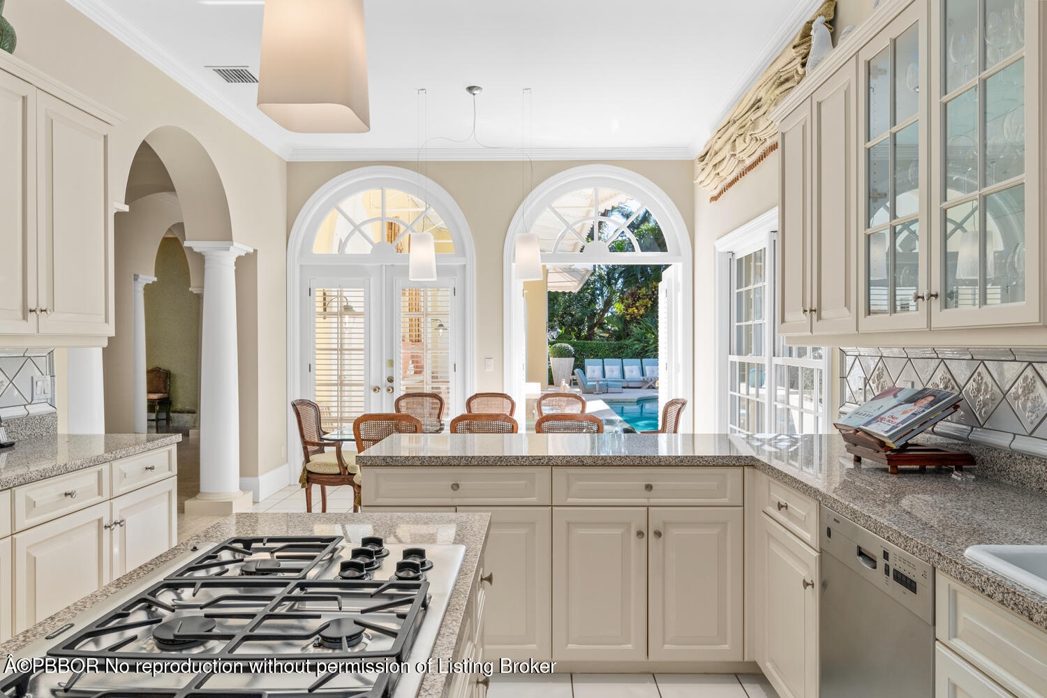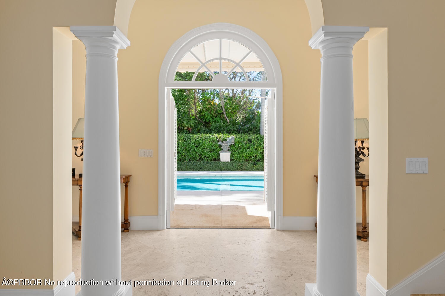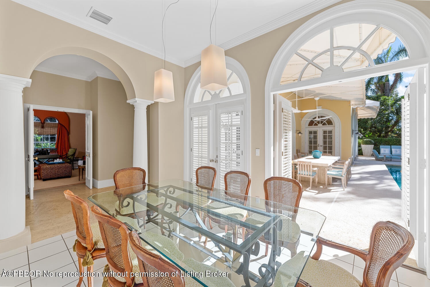 The spacious foyer opens to the formal living room and a central gallery hall that connects the main living areas. The family room, located on the south side, opens through French doors to the covered loggia and pool. On the north side, the gallery leads to the formal dining room, library, and kitchen with adjoining dining area—an ideal layout for both everyday living and entertaining.