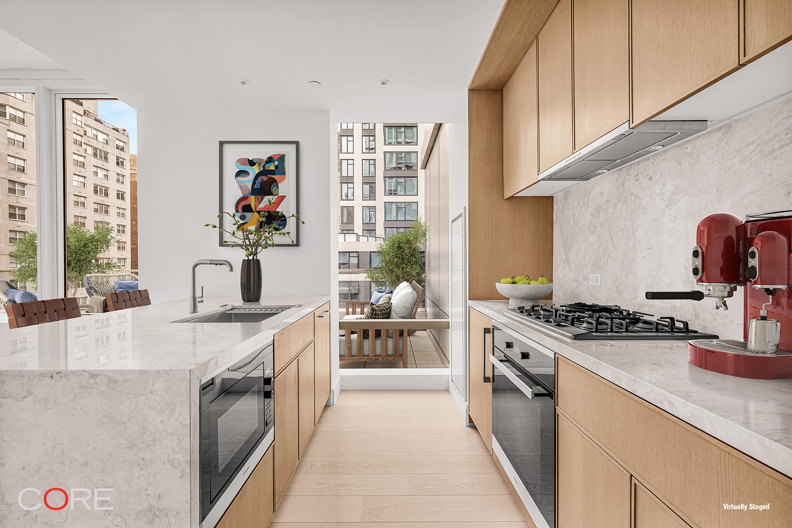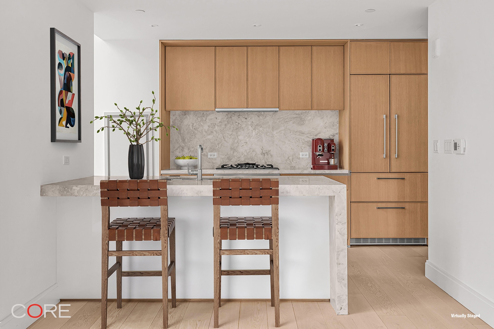 Kitchens feature custom-designed oak cabinetry, white marble countertops and backsplashes with grey veining, and integrated Miele appliances. Each kitchen is equipped with a stainless steel sink, Kohler fixtures in a titanium finish, and an in-sink garbage disposal. All residences include a Bosch stackable washer/dryer.