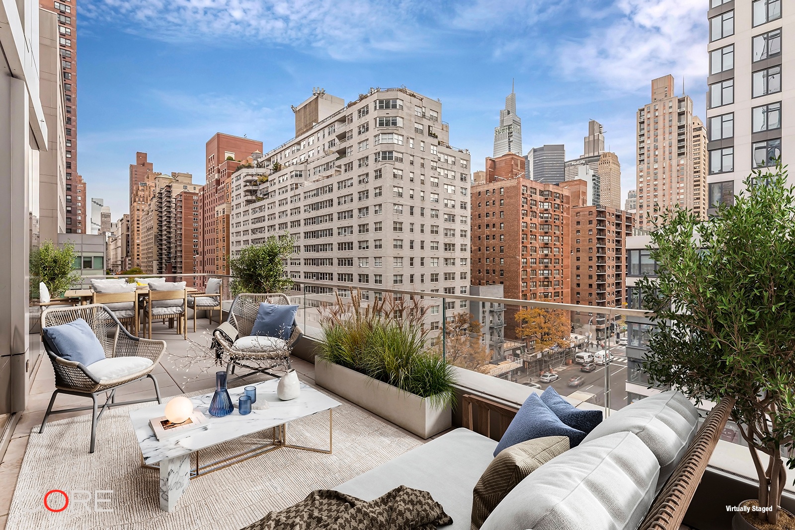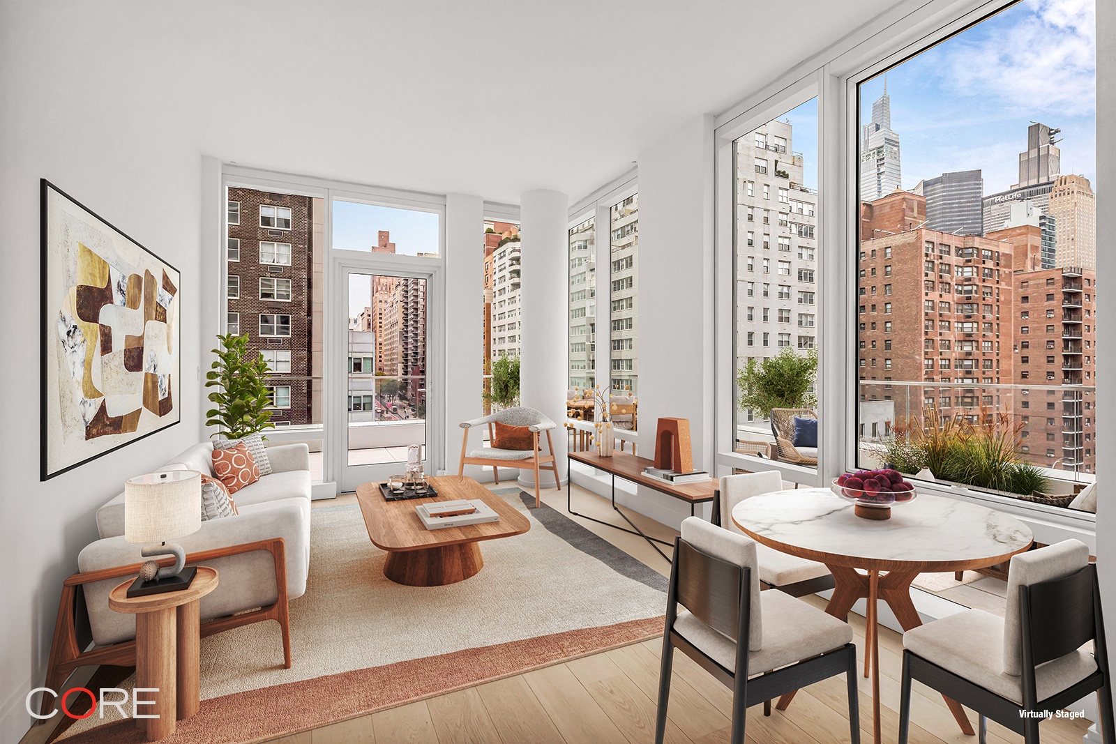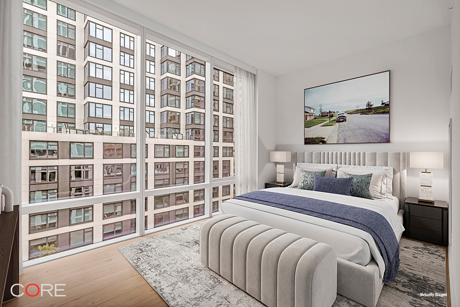 The north/west corner living room has wraparound floor-to-ceiling, sound-attenuated windows, enveloping the area in light. The stylish open kitchen with a large marble island also benefits from a wall of glass. The foyer has a perfect wall for displaying your favorite art and leads to two well-proportioned bedrooms. This unit also includes an adjoining terrace space.